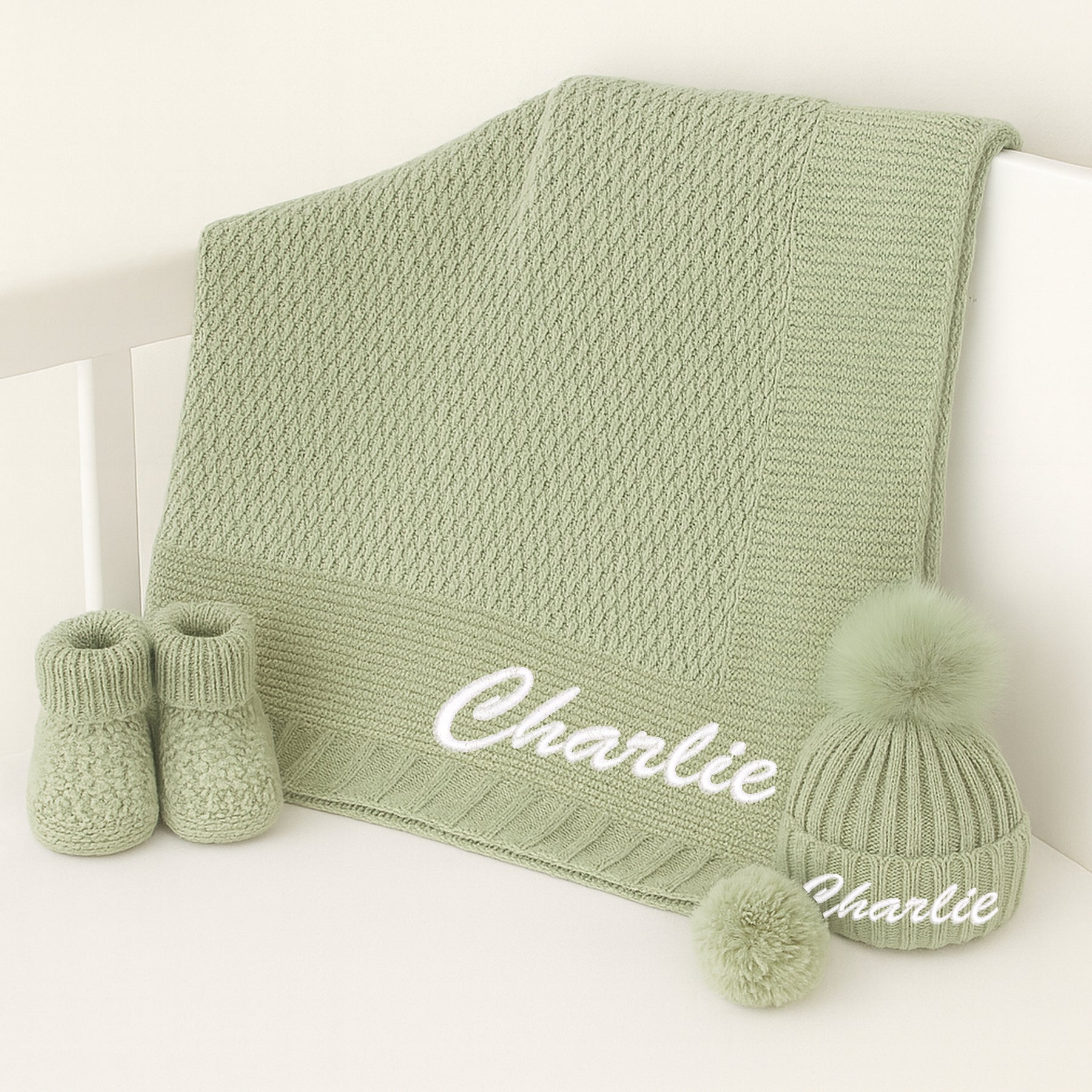 Personalised Embroidered Sage Green Baby Blanket, Hat and Booties