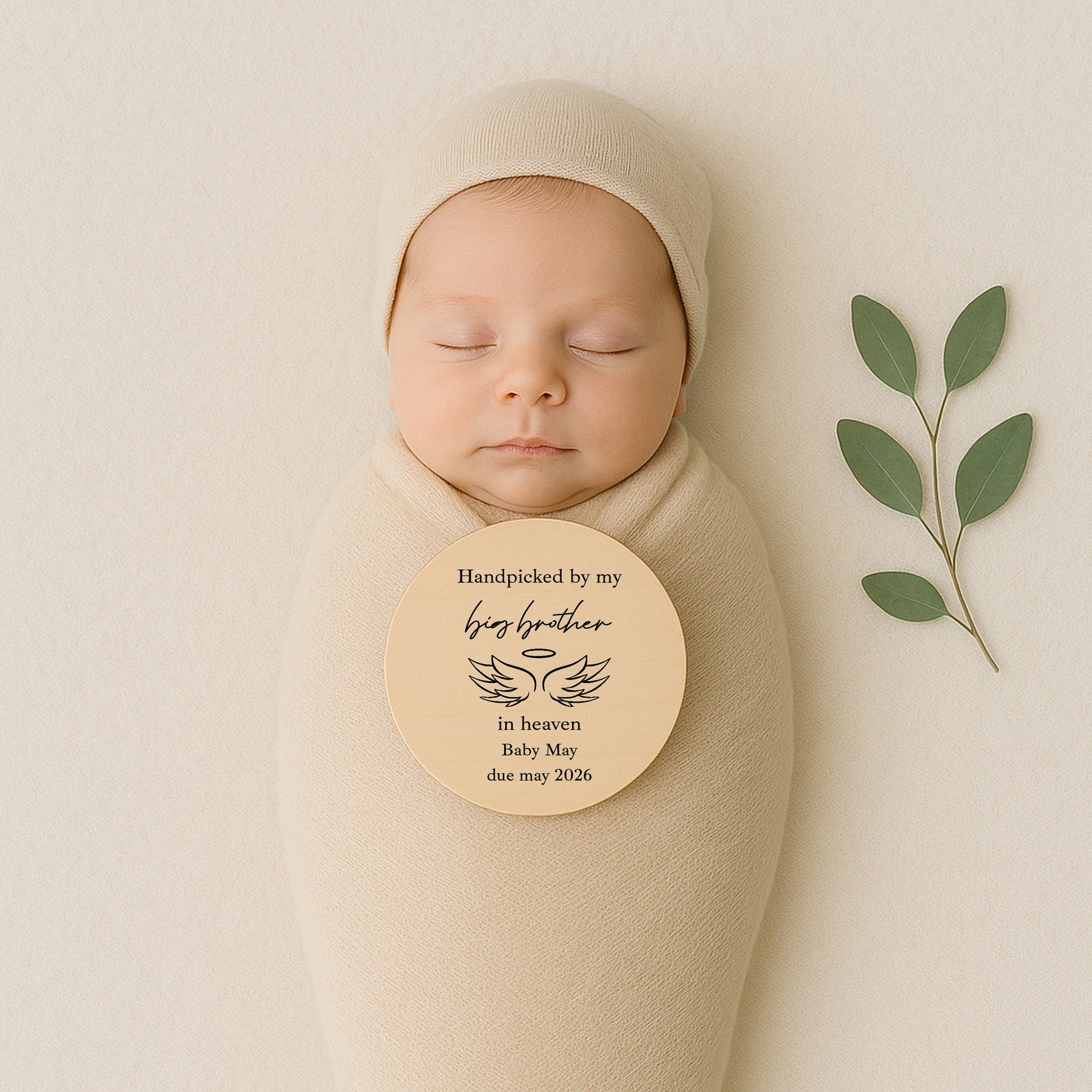 Celebrate the love that reaches beyond with our “Handpicked by My Big Brother in Heaven” Baby Announcement Plaque, a heartfelt keepsake symbolising the bond between siblings both near and far. This 10cm round wooden disc features the touching words “Handpicked by my big brother in heaven” alongside a delicate angel wings and halo design, personalised with your baby’s name and due date.