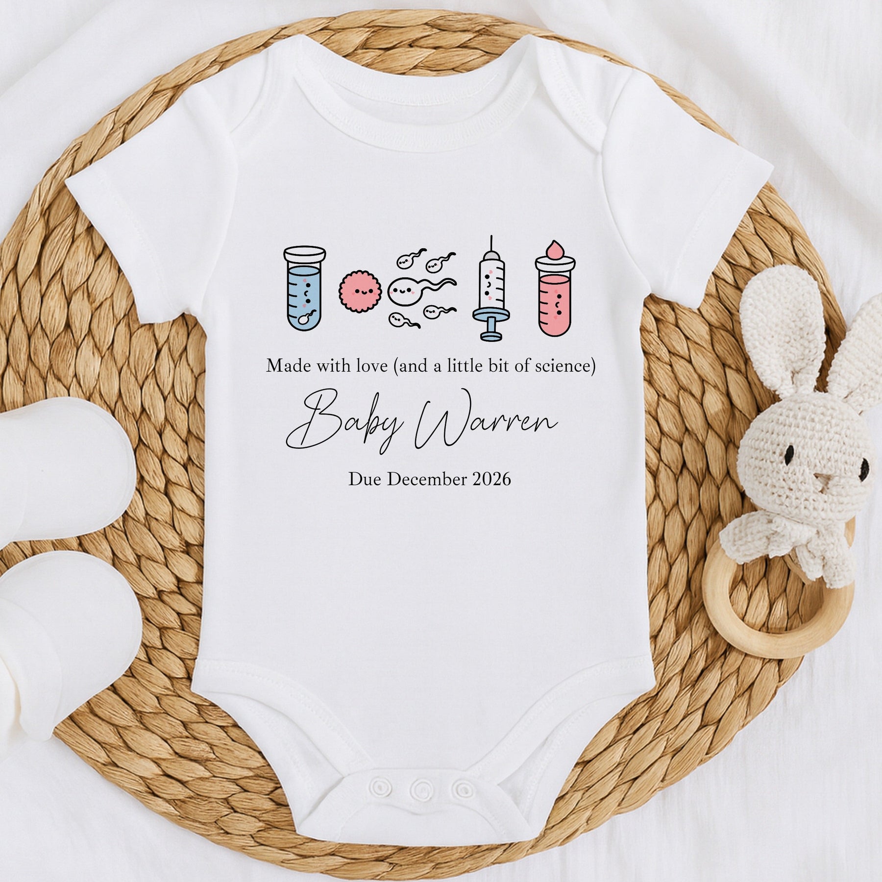 This personalised IVF baby vest, babygrow or bib is a joyful way to announce and celebrate a baby made with love — and a little science. Featuring sweet IVF-inspired illustrations and the wording “Made with love (and a little bit of science)”, it’s perfect for pregnancy announcements following IVF, ICSI, or a TTC journey.