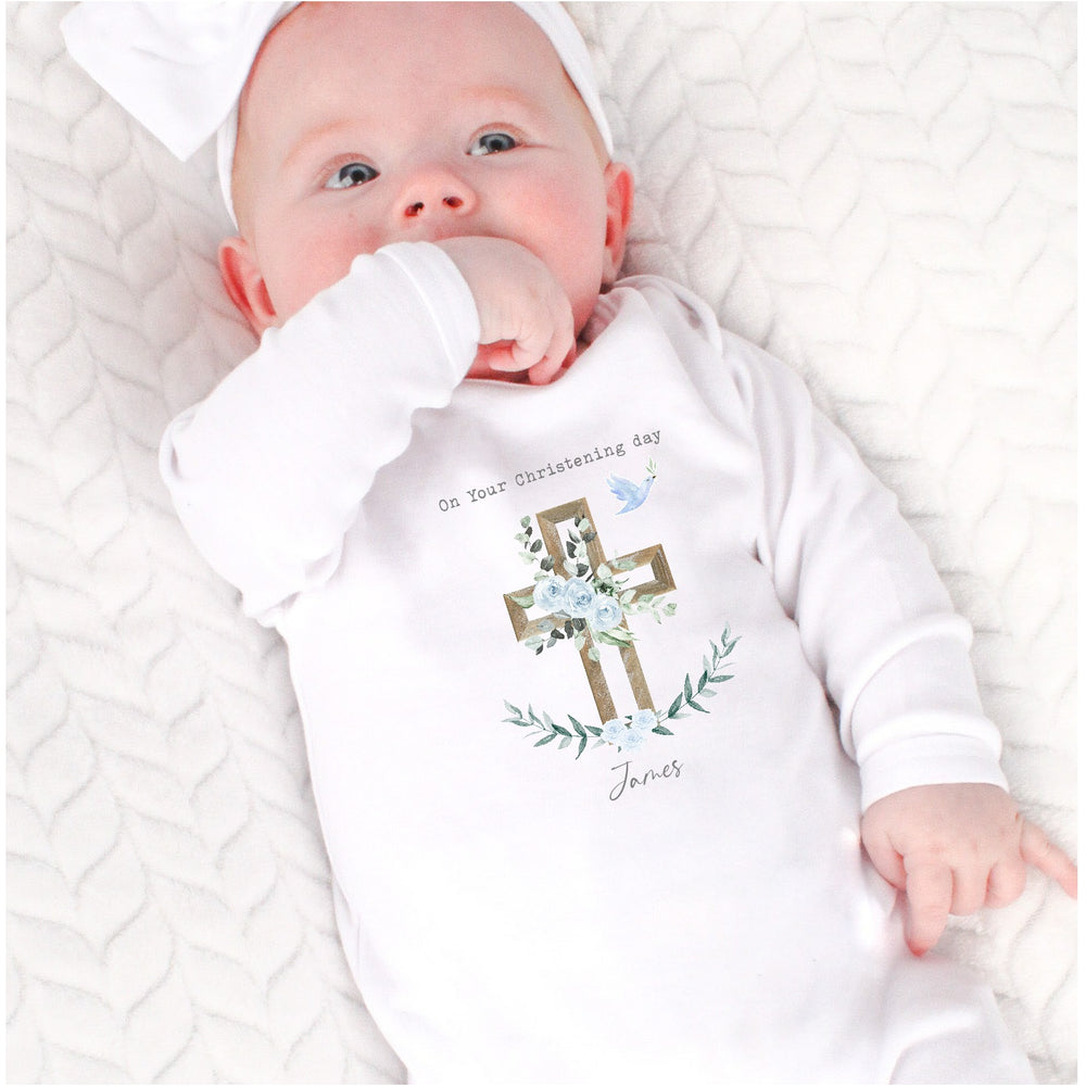 This personalised blue babygrow/vest is the perfect outfit for your little boy's christening! Made with soft and comfortable fabric, it features a customisable design that can be uniquely tailored to your child. Give your little one a special outfit for their special day.