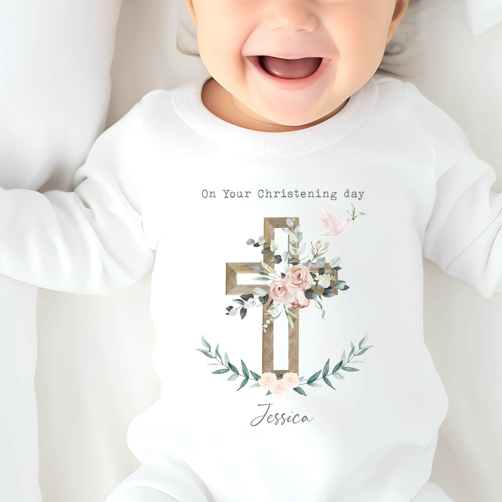 This personalised blue babygrow/vest is the perfect outfit for your little girl's christening! Made with soft and comfortable fabric, it features a customisable design that can be uniquely tailored to your child. Give your little one a special outfit for their special day.
