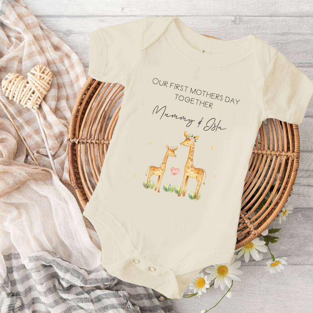 Personalised Our First Mother's Day Giraffes Beige Babygrow/Vest
