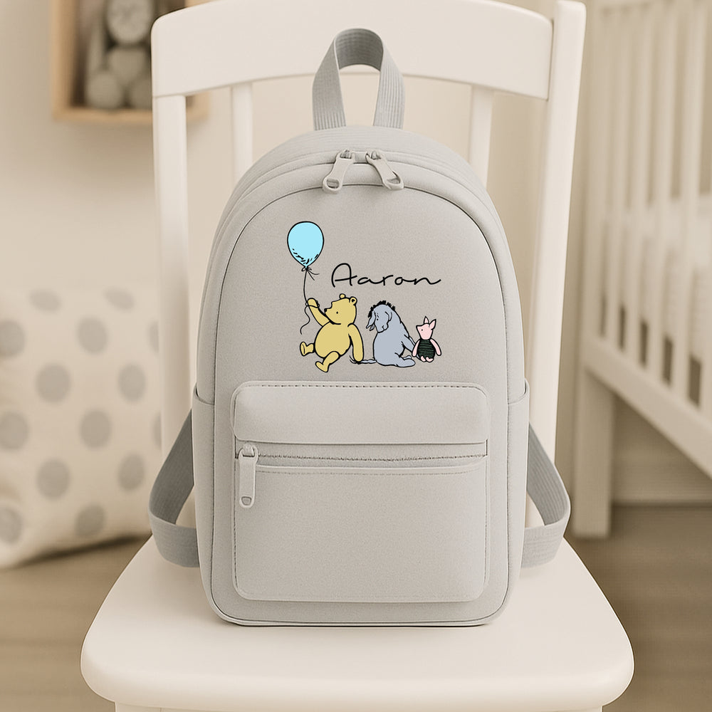 This Personalised Pooh Bear Backpack is perfect for school, holidays, or everyday fun. Available in five lovely colors—blue, mint green, grey, navy blue, and khaki green—it offers a charming and practical way for your child to carry their essentials. Personalised to make it truly special, this backpack combines comfort and style to support your little one’s adventures.