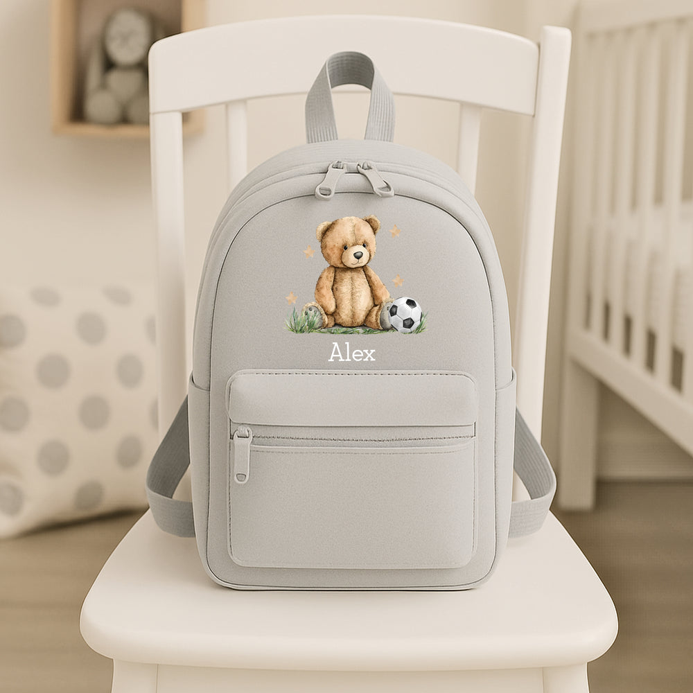 This Personalised Teddy Football Backpack is perfect for school, holidays, or everyday fun. Available in four charming colours—blue, mint green, grey, and khaki green—it offers a playful yet practical way to carry essentials. Personalise it to make your child’s bag truly unique, combining style and function to support their busy days with comfort and cheer.