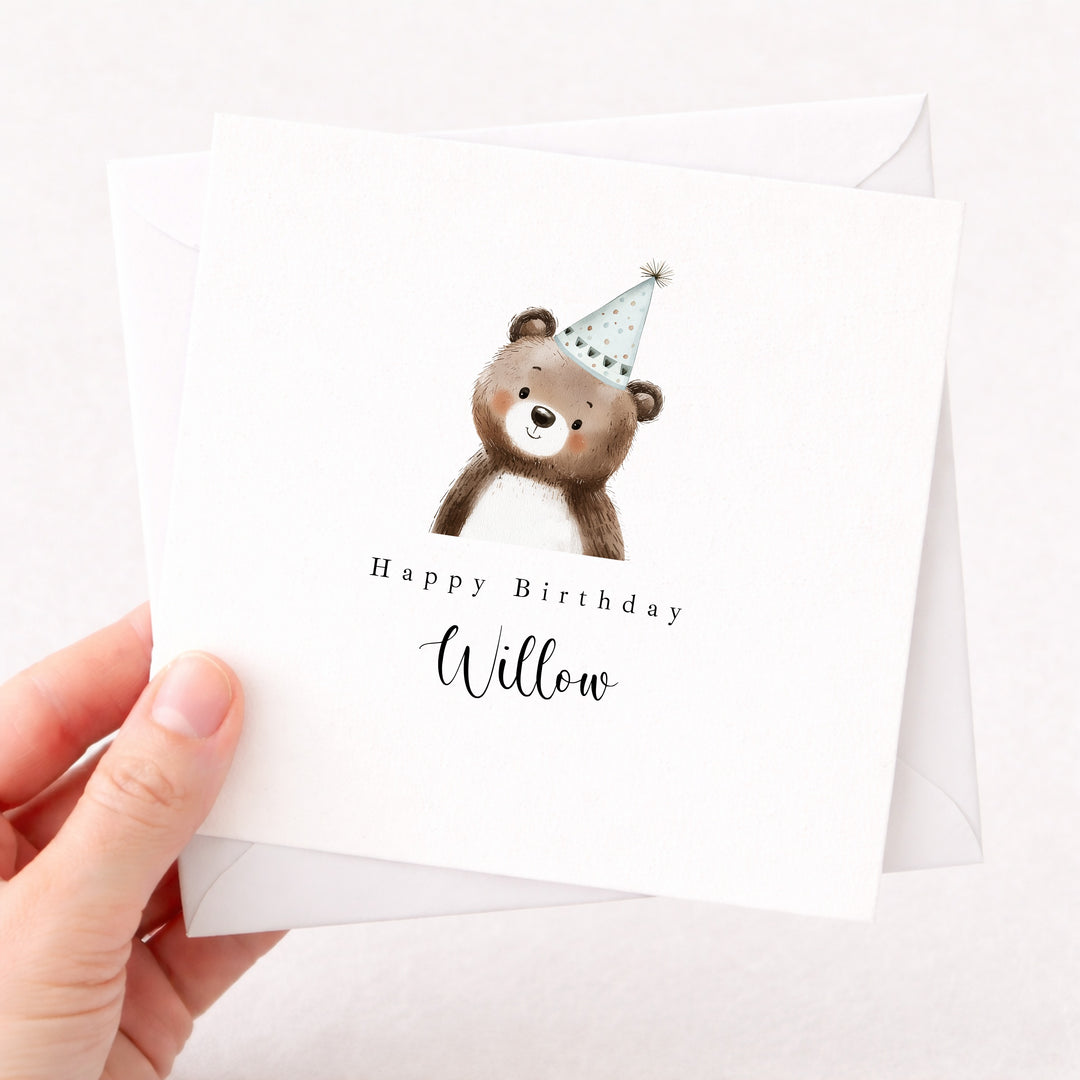Personalised Blue Bear Party Hat Birthday Card