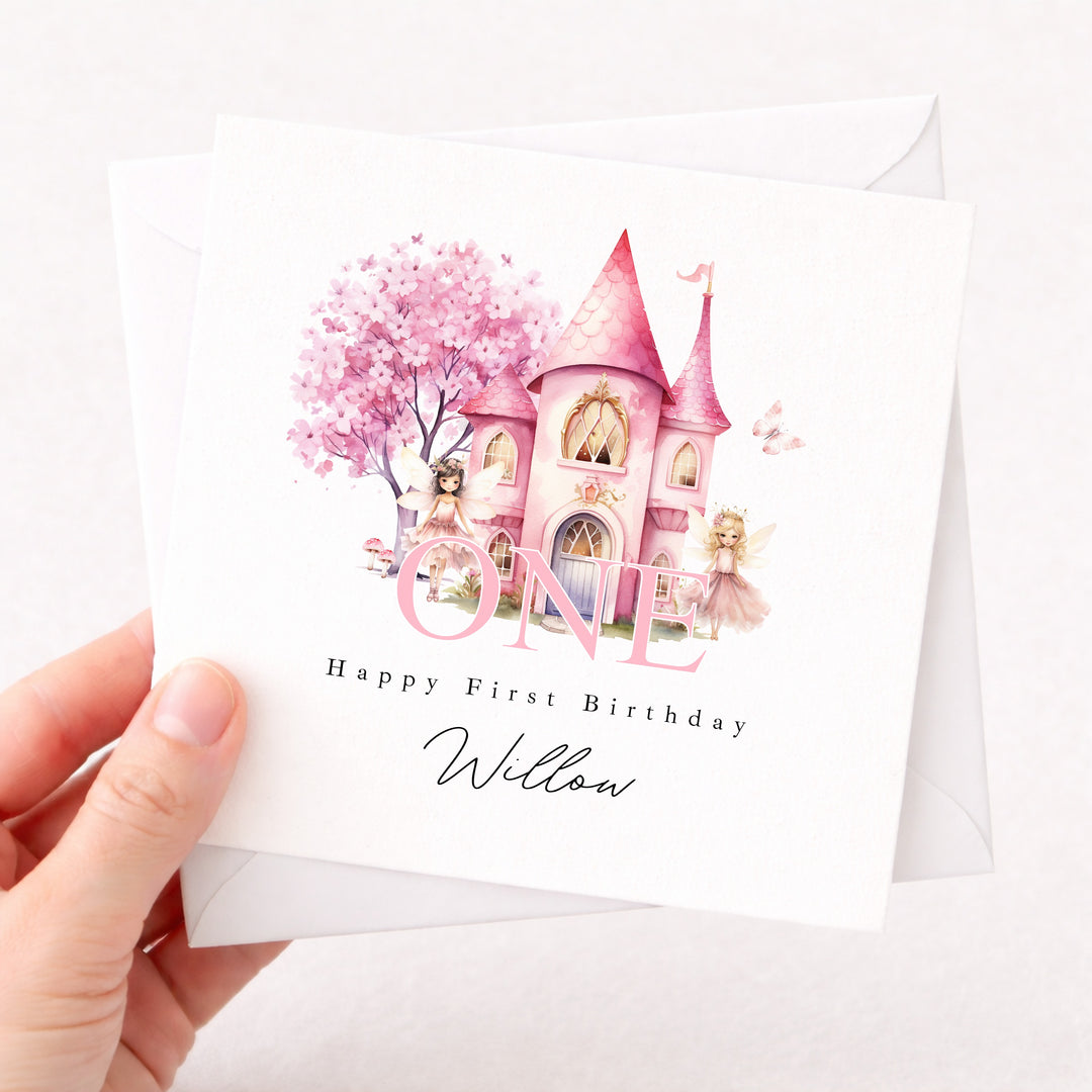 Personalised Pink Fairy Castle Birthday Card