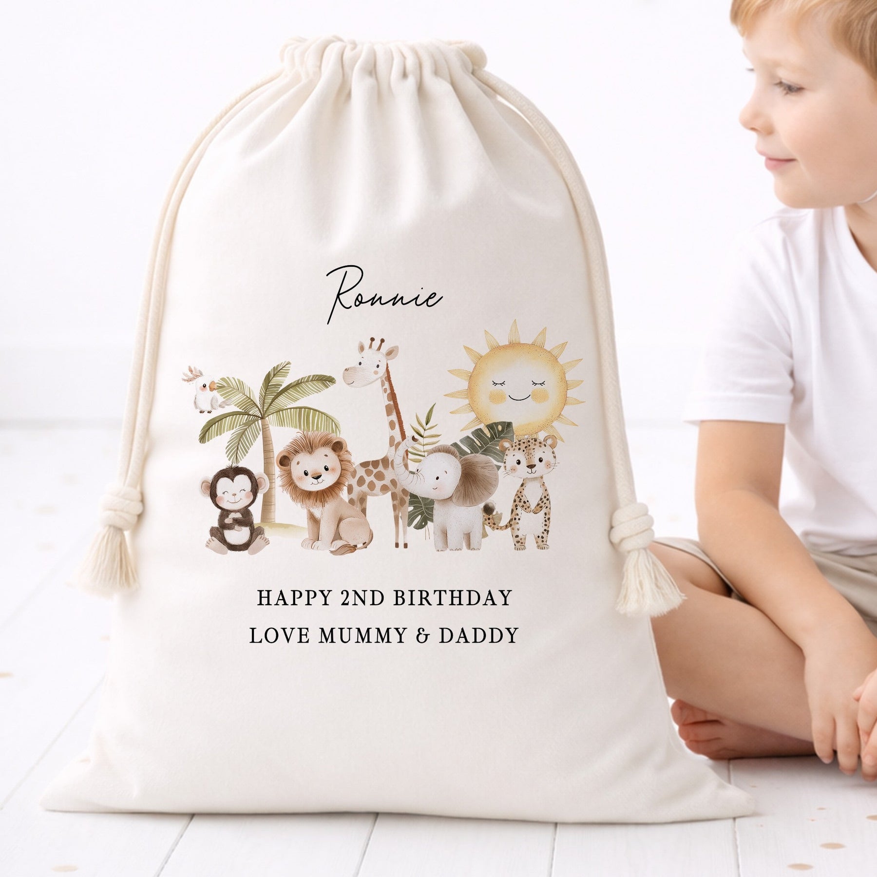 Designed for both boys and girls who love safari animals and jungle adventures, this sack can be personalised with any name and age, making it perfect for a 1st birthday, 2nd birthday, or any milestone celebration. Available in multiple size options — Small (30×25 cm), Medium (45×30 cm), Large (40×50 cm), and X-Large (75×49 cm) — there’s plenty of room for everything from small keepsakes to larger presents. A brilliant choice for your child, grandchild, niece, nephew, or godchild.