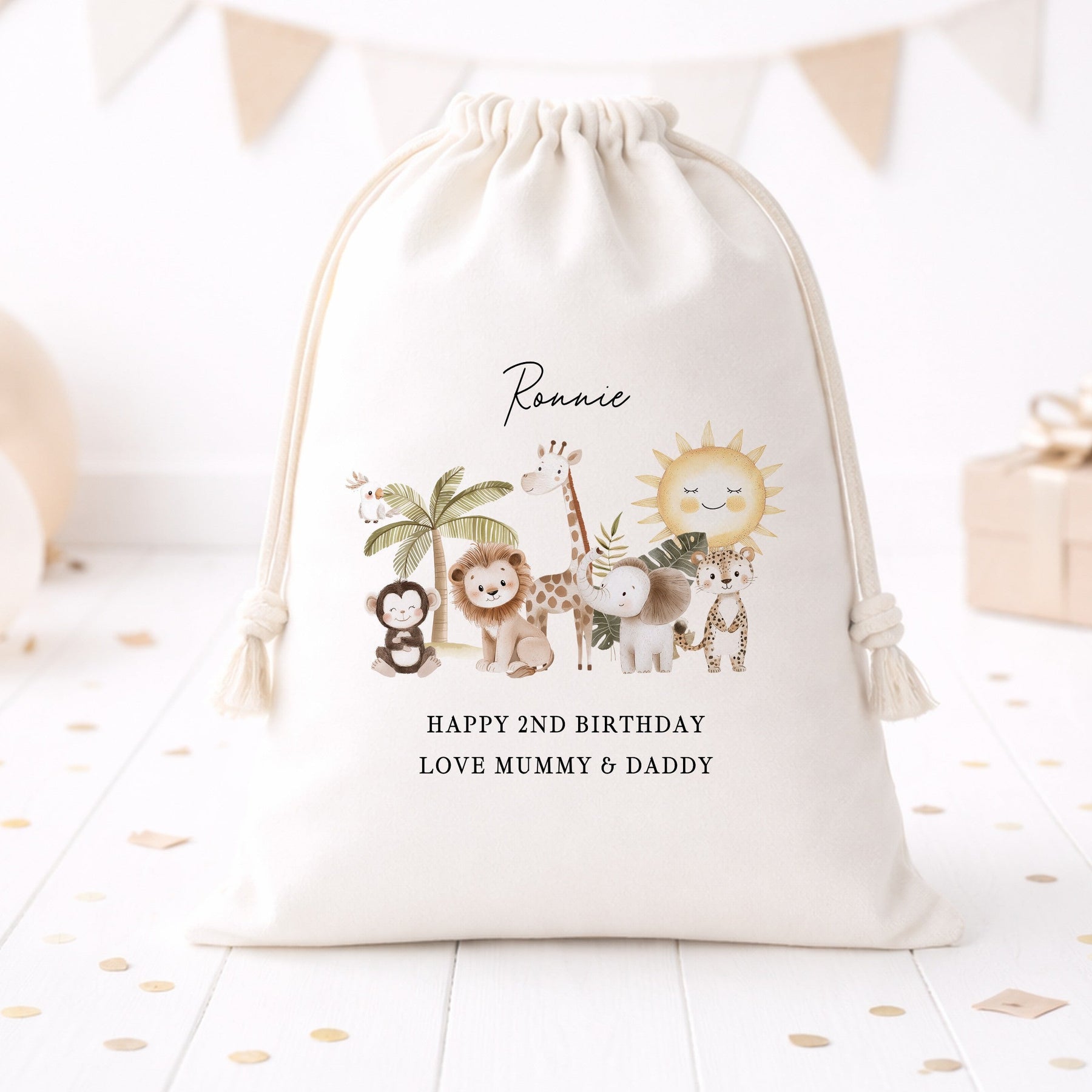 Make their birthday extra special with our personalised safari birthday gift sack, perfect for little adventurers celebrating their big day! Made from durable natural cotton canvas with a classic drawstring top, this reusable gift bag is printed using vibrant child-safe DTG inks for a high-quality, long-lasting finish. It’s ideal for wrapping toys, clothes, books, and birthday surprises in a fun and memorable way.