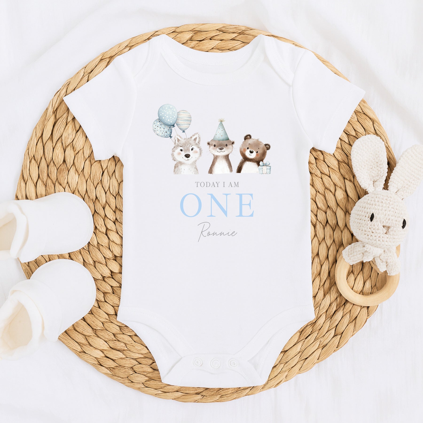 Celebrate your little boy’s special milestone with this adorable woodland animal first birthday outfit, featuring a sweet wolf, otter and bear with soft blue balloons and party hat. Personalised with your child’s name, this outfit is perfect for a first birthday celebration, cake smash photoshoot or birthday party.