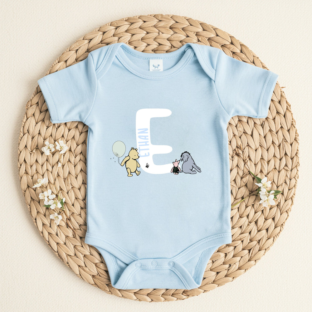 Personalised Pooh Bear Initial Blue Babygrow/Vest