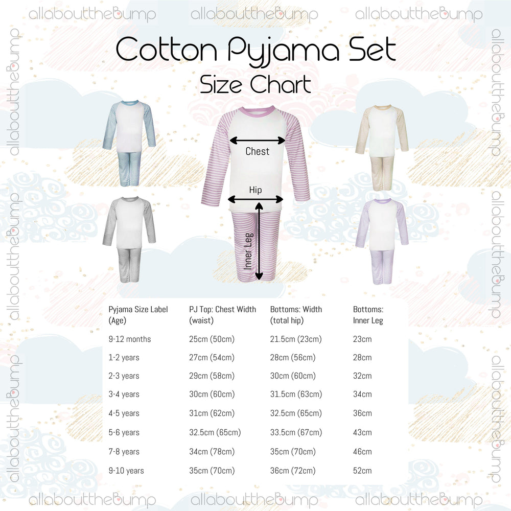 A size chart for the Easter pyjamas. They are avaliable from 9-12 Months to 9-10 Years