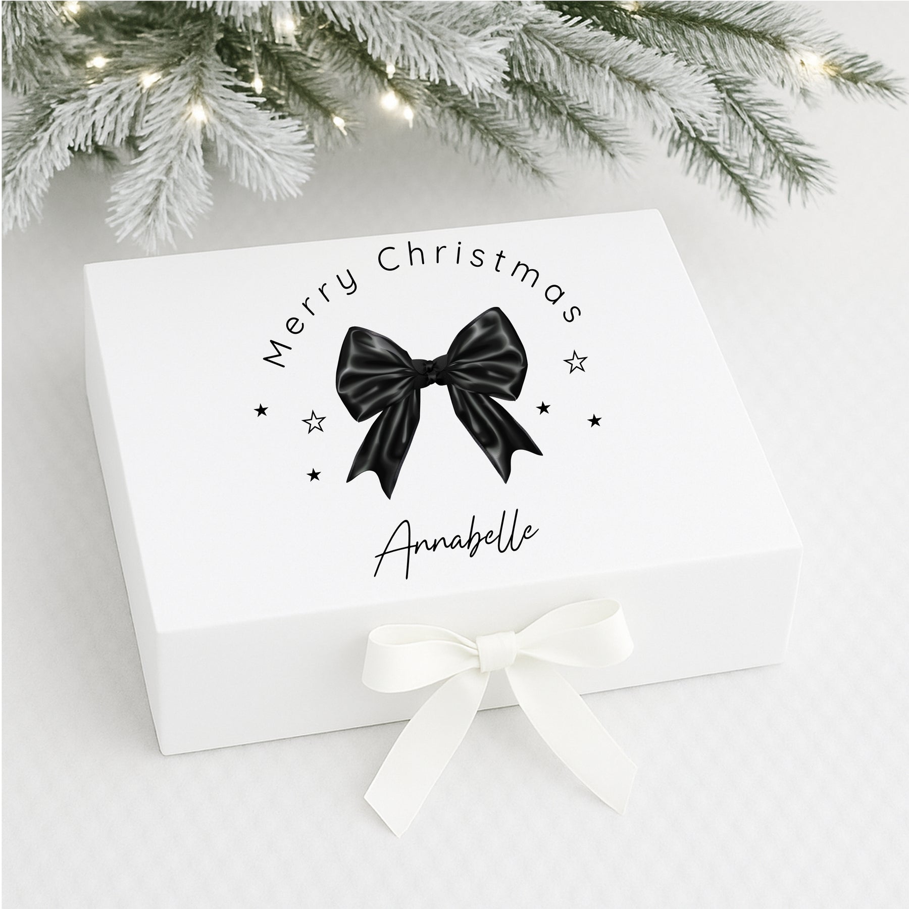 Celebrate the magic of Christmas Eve with this Personalised Black Bow Merry Christmas Eve Box. Designed to hold special treats and memories, this festive box is perfect for creating joyful traditions. The vibrant red bow adds a charming touch, while personalisation makes it a unique keepsake for your loved ones. Perfect for keeping Christmas Eve moments extra special and full of warmth.