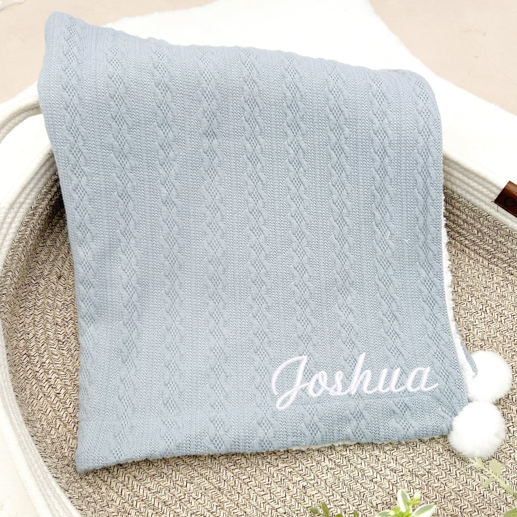 Wrap your precious little one in this beautiful Personalised Embroidered Dusty Blue Baby Knitted Pompom Blanket. The soft, knitted fabric and delicate pompoms will keep your baby cozy and stylish. Add a special touch with custom embroidery. Perfect for snuggles and heartfelt gifts.
