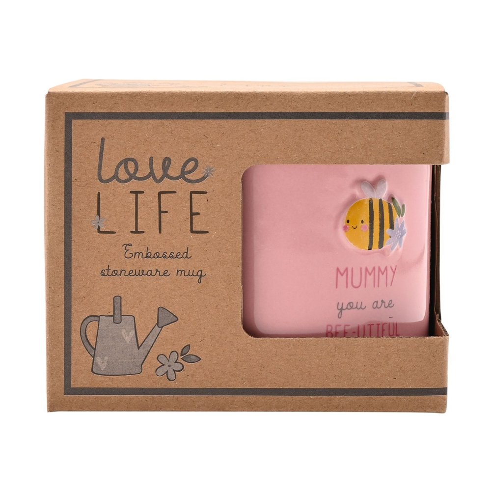 Classic ceramic mug in soft pastel colours with a 3D embossed bee and with the words 'Mummy you are bee-utiful' for a special Mummy. In a gift-ready box, this is the ideal everyday mug to add a little sunshine to any home! Suitable for microwave and dishwasher.