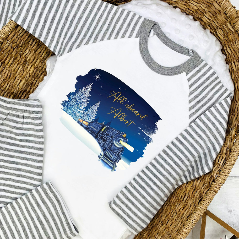 Personalised Christmas Train Grey Striped Pyjamas