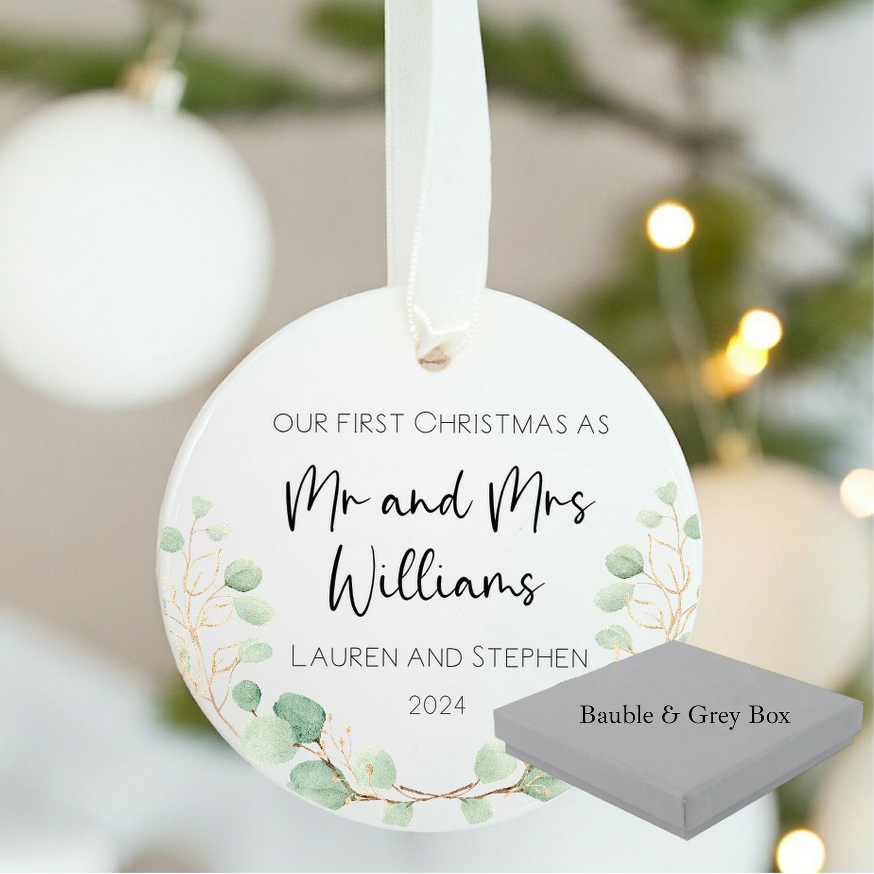 Celebrate your first festive season as a married couple with this beautiful personalised leaf wreath ornament. This special keepsake features elegant "Mr & Mrs" text surrounded by a delicate leaf design, creating a meaningful decoration you'll treasure for years to come. A perfect way to mark your first Christmas together or a thoughtful gift for newlyweds.