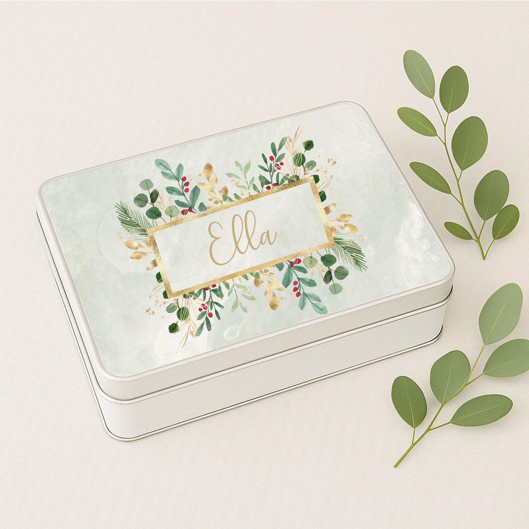 Store your festive treats in style with this personalised Christmas wreath tin. Featuring a beautiful wreath design, it can be customised with a name or special message, making it a thoughtful and practical addition to your holiday celebrations. Perfect for keeping cookies, candies, or small gifts fresh while adding a personal touch to your Christmas traditions.