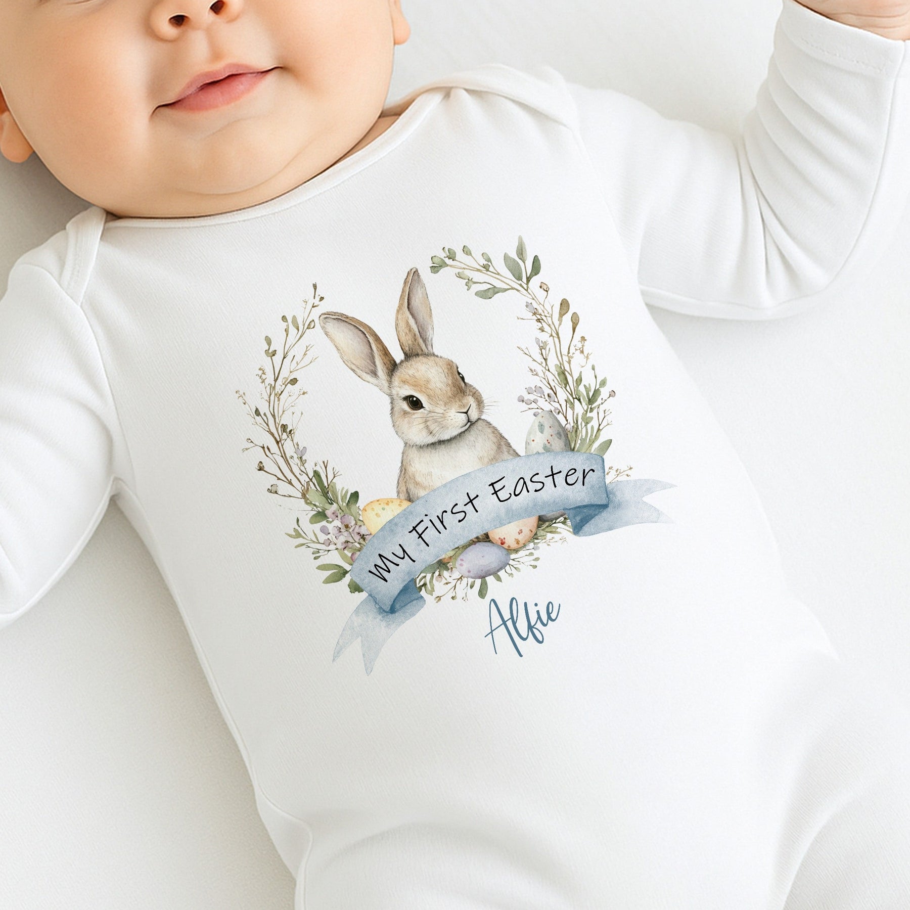 Personalised Blue Bunny Wreath My First Easter Baby Grow, Vest or Bib
