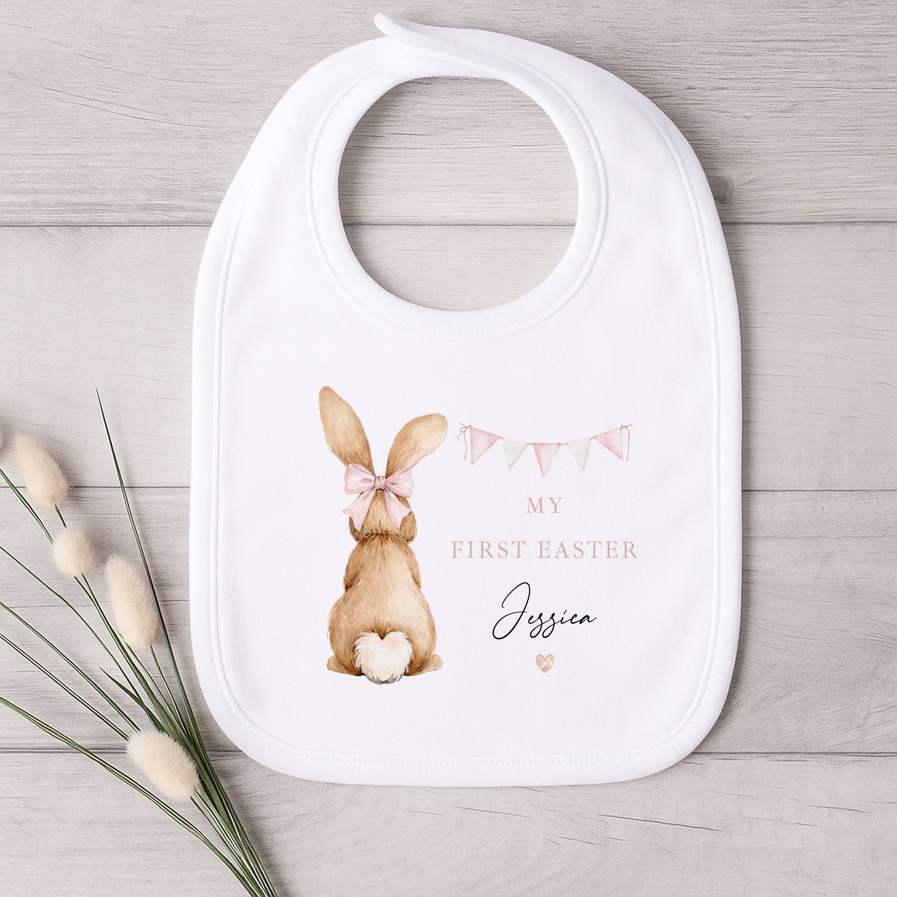 Celebrate a precious milestone with this beautifully illustrated personalised My First Easter pink bunny design. Featuring a sweet bunny with a pink bow nestled inside a delicate floral wreath, this outfit is perfect for marking my first easter or my 1st easter. Each item is personalised with your chosen name and year, creating a meaningful keepsake gift for baby girls or a boy girl unisex gift.