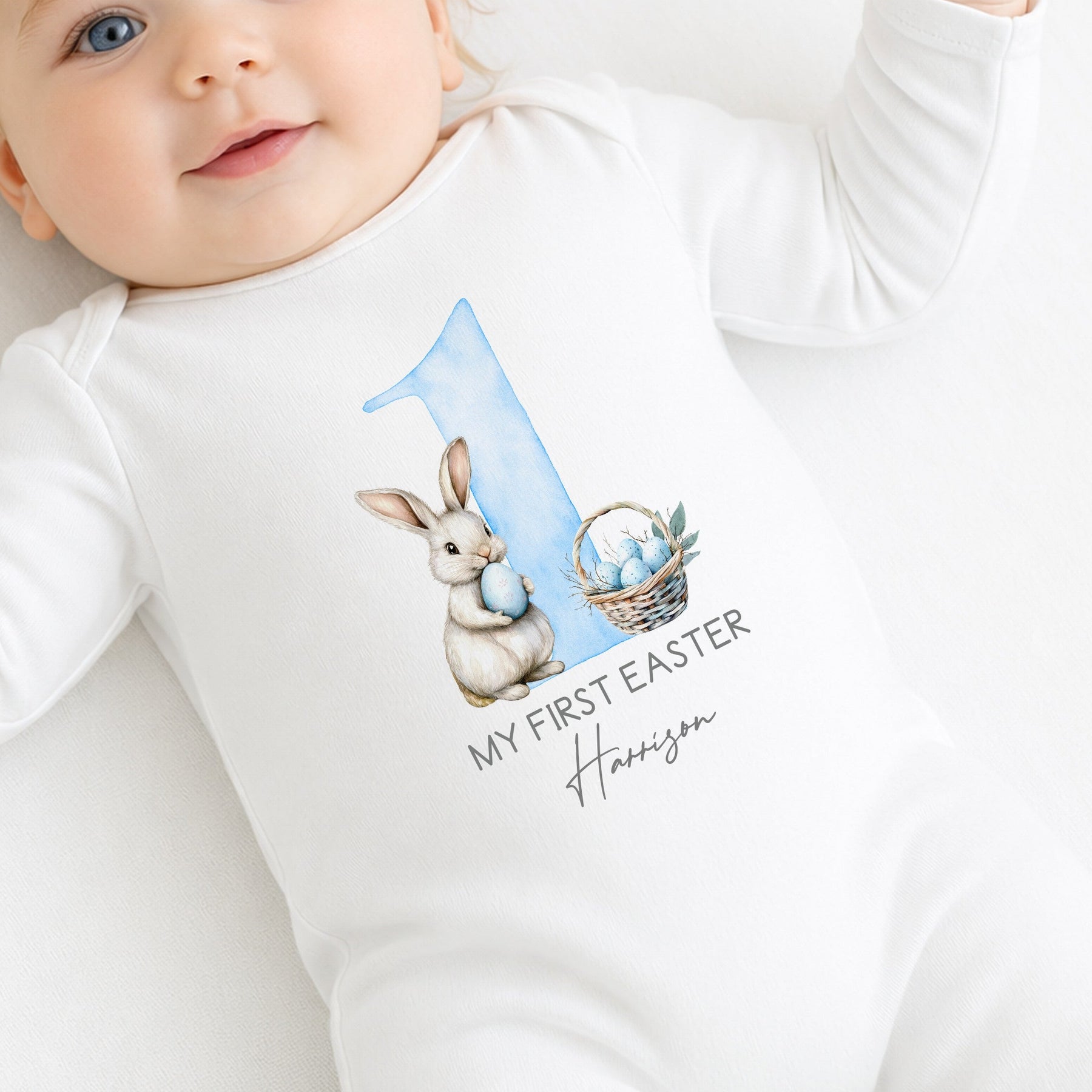 Personalised White Bunny Blue Bow Tie My 1st Easter Baby Grow, Vest or Bib