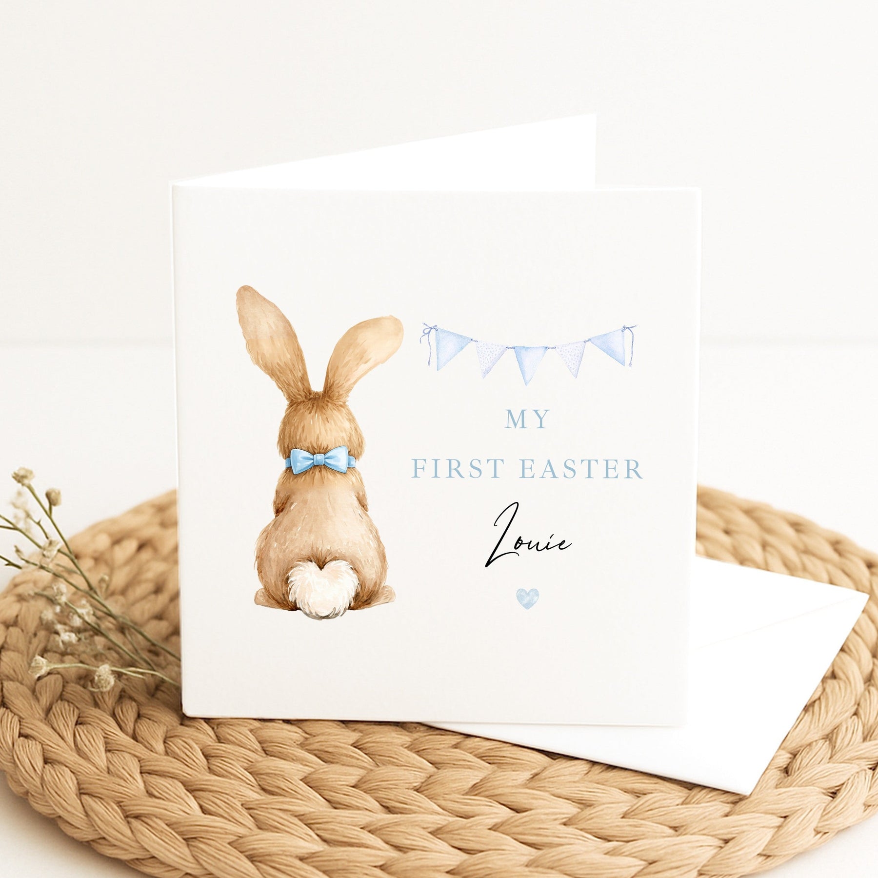 Celebrate a precious milestone with this beautiful personalised My First Easter card featuring a sweet bunny with a blue bow and delicate bunting banner. Perfect for marking my first easter or my 1st easter, this charming design makes a thoughtful keepsake for a baby boy, girl or unisex gift. Add your chosen name to create a personalised name bunny card that will be treasured for years.
