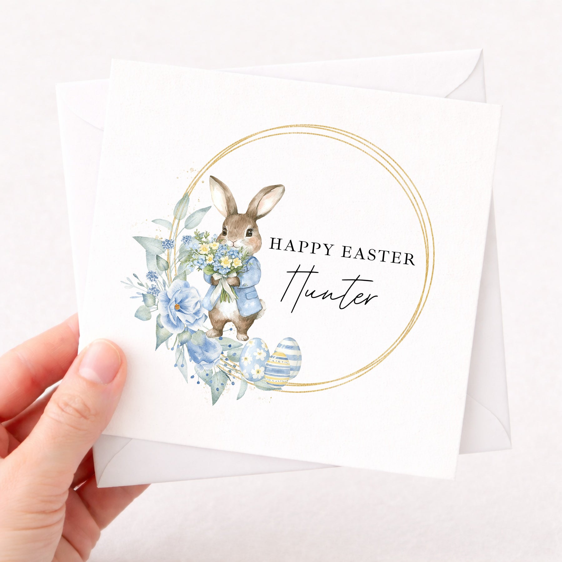 Celebrate Easter with this beautifully illustrated personalised bunny wreath card, featuring a sweet rabbit holding flowers, surrounded by soft blue florals and delicate Easter eggs. This charming design makes a thoughtful keepsake gift and is perfect for celebrating my first easter or my 1st easter. Add your chosen name to create a personalised name bunny card that feels extra special.