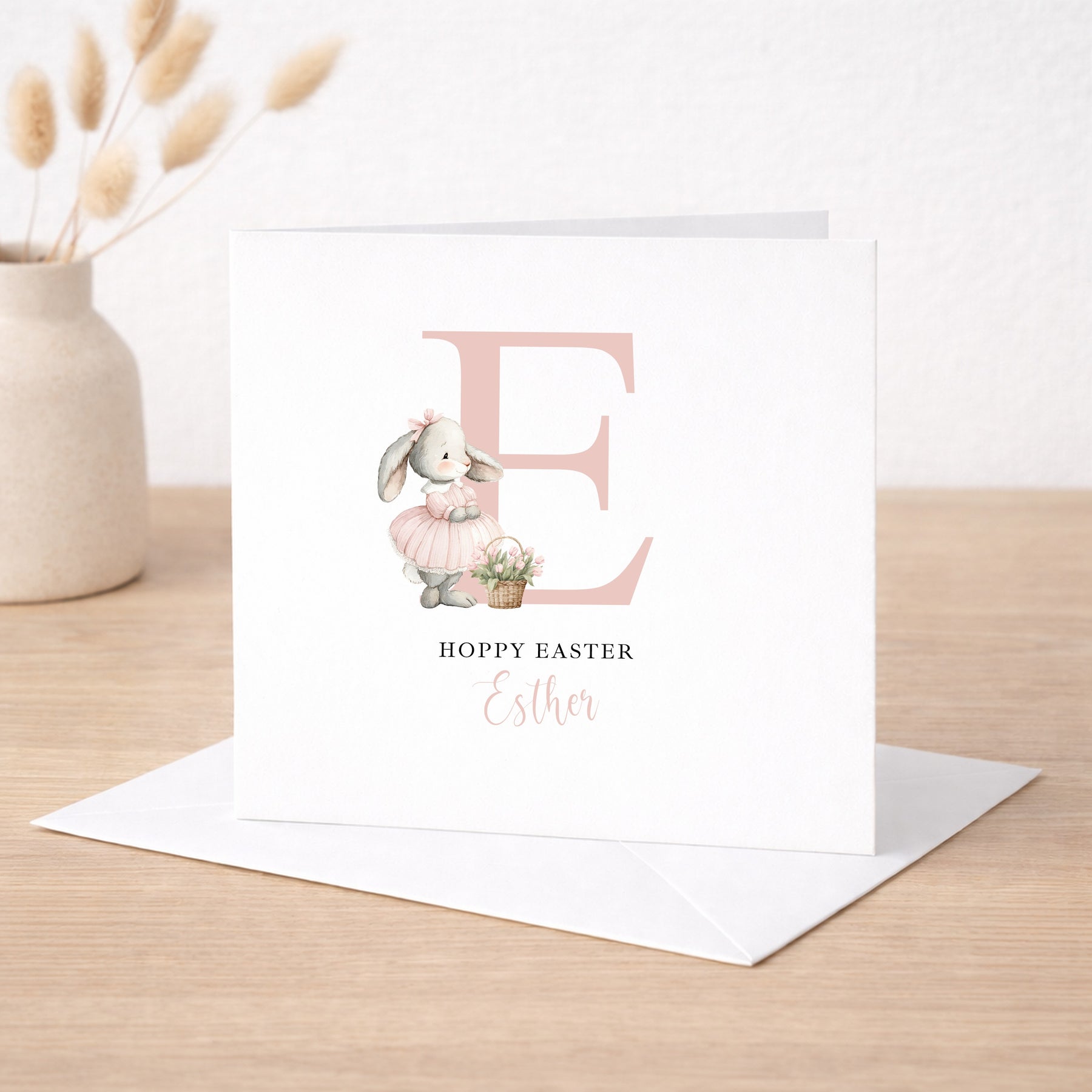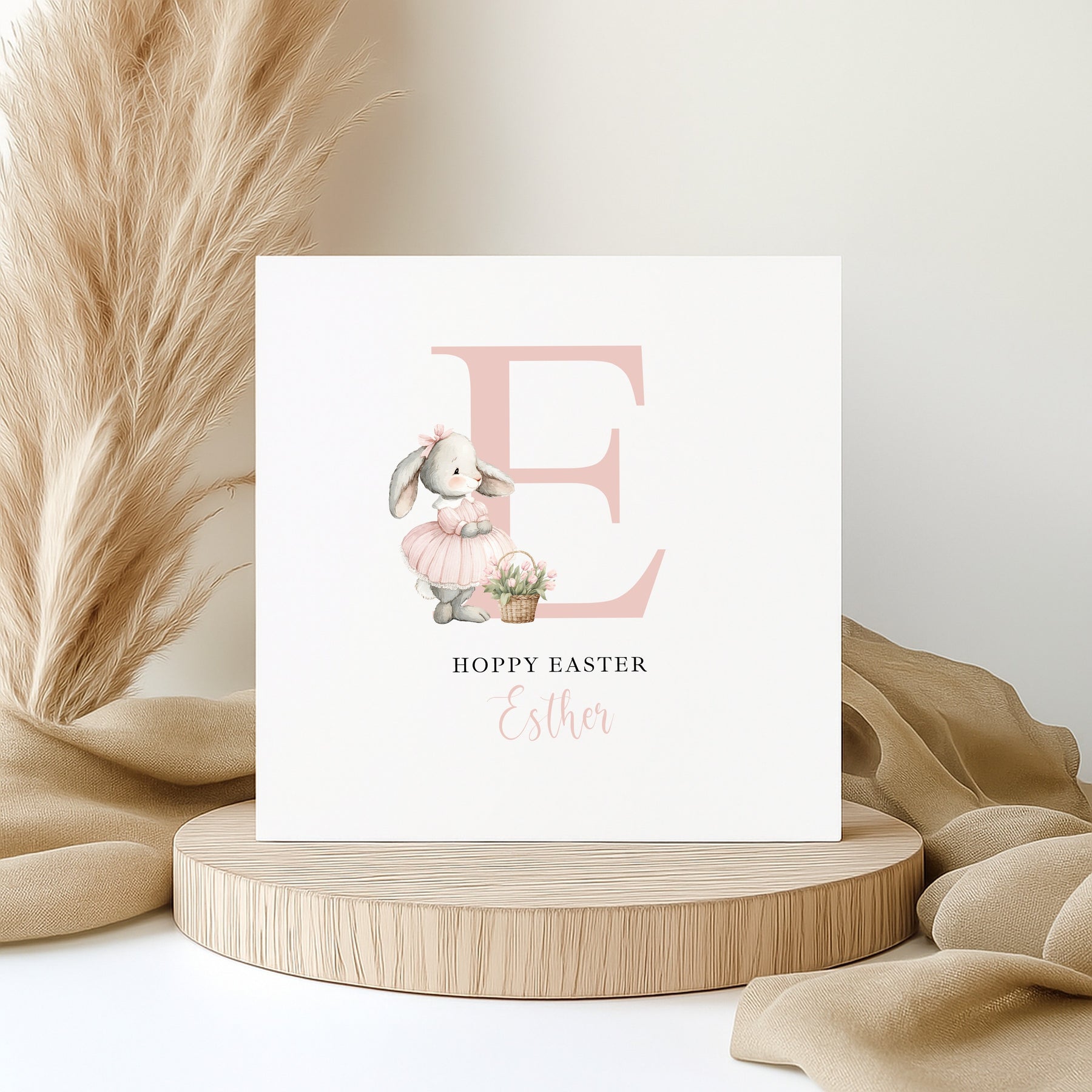 Celebrate a precious milestone with this personalised Happy Easter card featuring a sweet bunny in a pink dress beside a floral basket, set against a soft blush initial. Perfect for marking my first easter or my 1st easter, this beautiful design creates a meaningful keepsake gift for a little one’s special celebration. Add your chosen initial and name to create a personalised name bunny card that will be treasured for years to come.