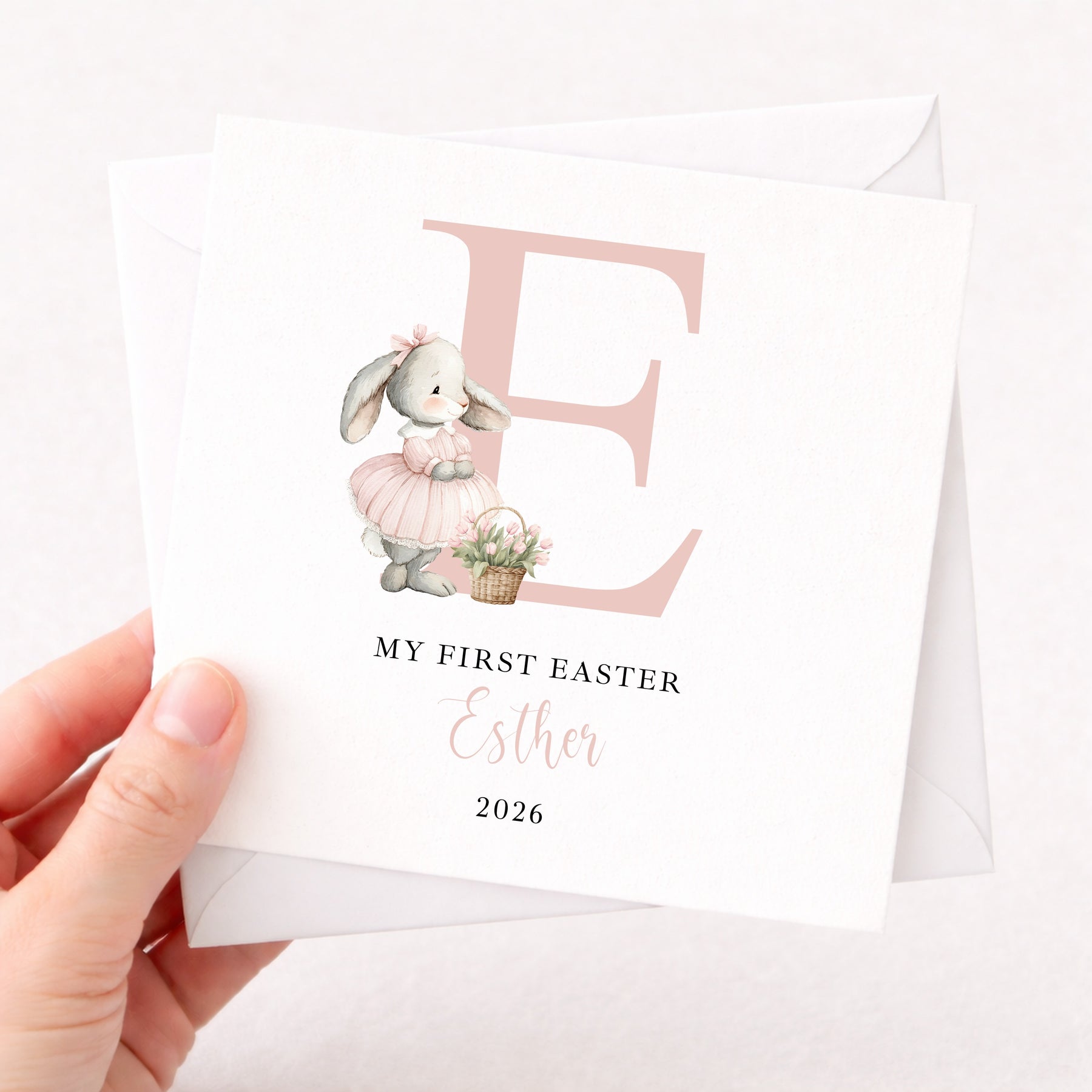 Celebrate a precious milestone with this personalised My First Easter 2026 card featuring a sweet bunny in a pink dress beside a floral basket, set against a soft blush initial. Perfect for marking my first easter or my 1st easter, this beautiful design creates a meaningful keepsake gift for a little one’s special celebration. Add your chosen initial and name to create a personalised name bunny card that will be treasured for years to come.