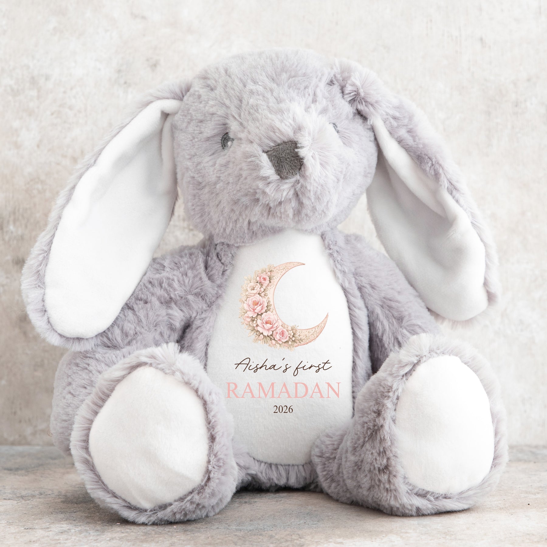 Each soft toy measures approximately 23cm and is made from soft, plush, child-friendly materials. The Ramadan design is professionally sublimated onto the toy, creating a smooth, long-lasting finish. Bunny options are available in pink, blue, white, beige or grey, with a beige teddy bear option also available.