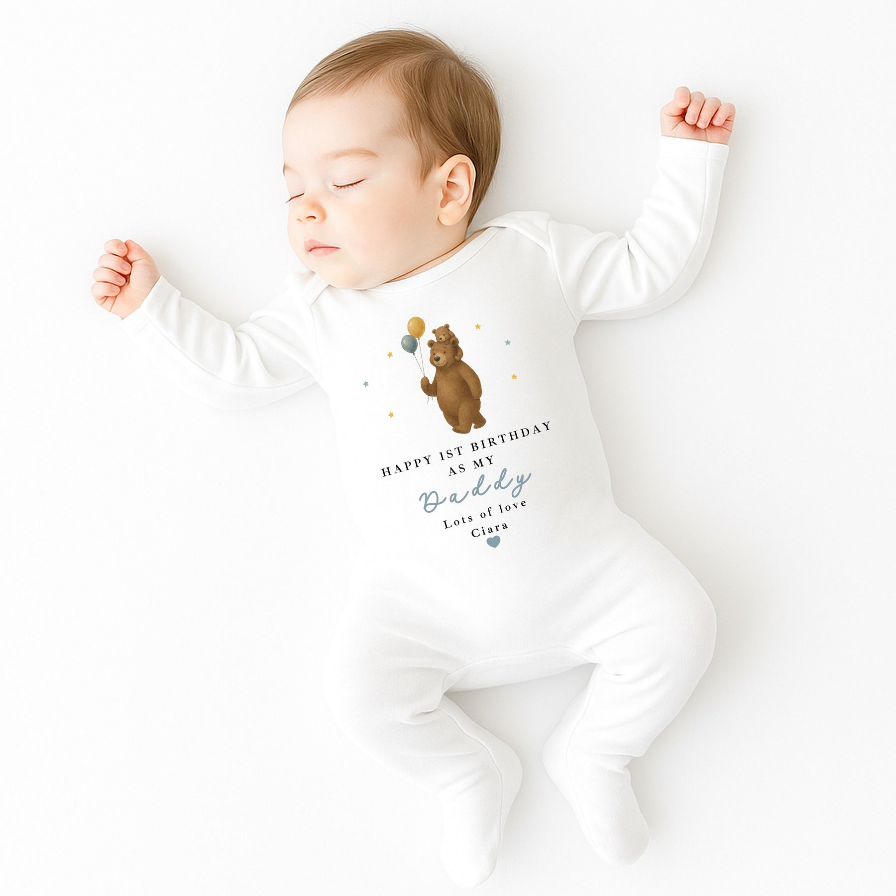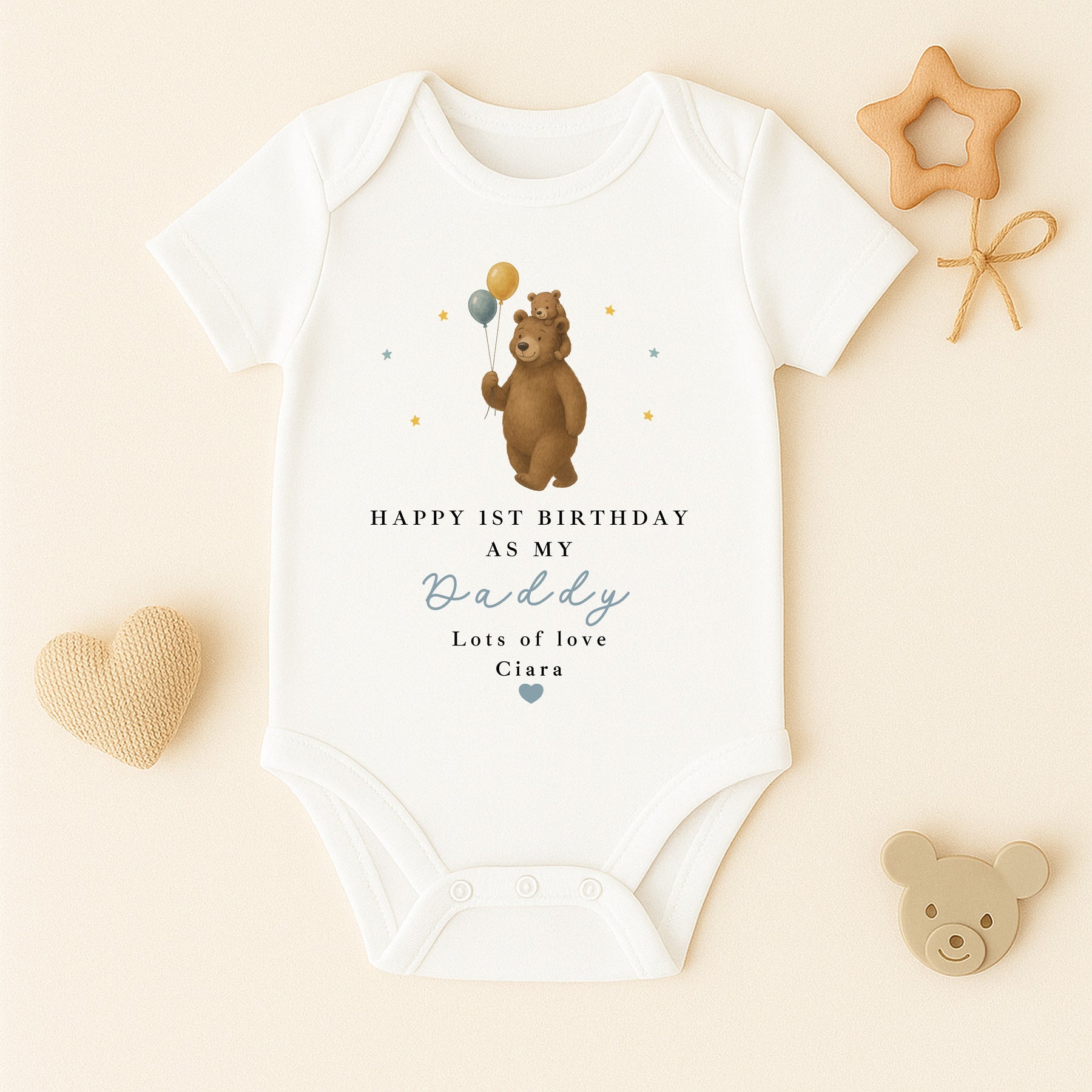 Celebrate Daddy’s special milestone with this adorable “Happy 1st Birthday as My Daddy” outfit, the perfect keepsake gift from baby to mark his first year of being a dad! Featuring a sweet brown bear holding balloons, this heartwarming design captures the love and joy between daddy and baby. Made from soft 100% cotton that’s gentle and breathable for babies, it ensures ultimate comfort for little ones while looking picture-perfect for Daddy’s big day. Each outfit is digitally printed for bright, lasting colour, and is available as a vest, babygrow, or T-shirt to suit every season and style.