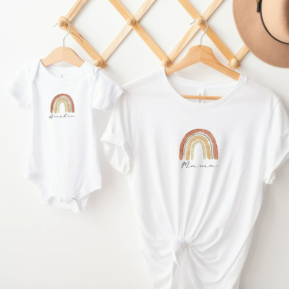 Match with your little one in style with our Personalised Beige Rainbow Matching Mum & Child Outfits. Made with care and love, these outfits can be personalized for a special touch. A perfect way to showcase your bond with your child while staying fashionable. Order now!