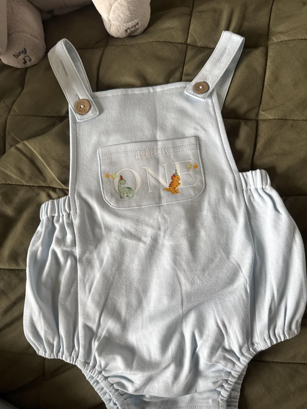 Personalised Blue Dinosaur Party First Birthday Dungarees