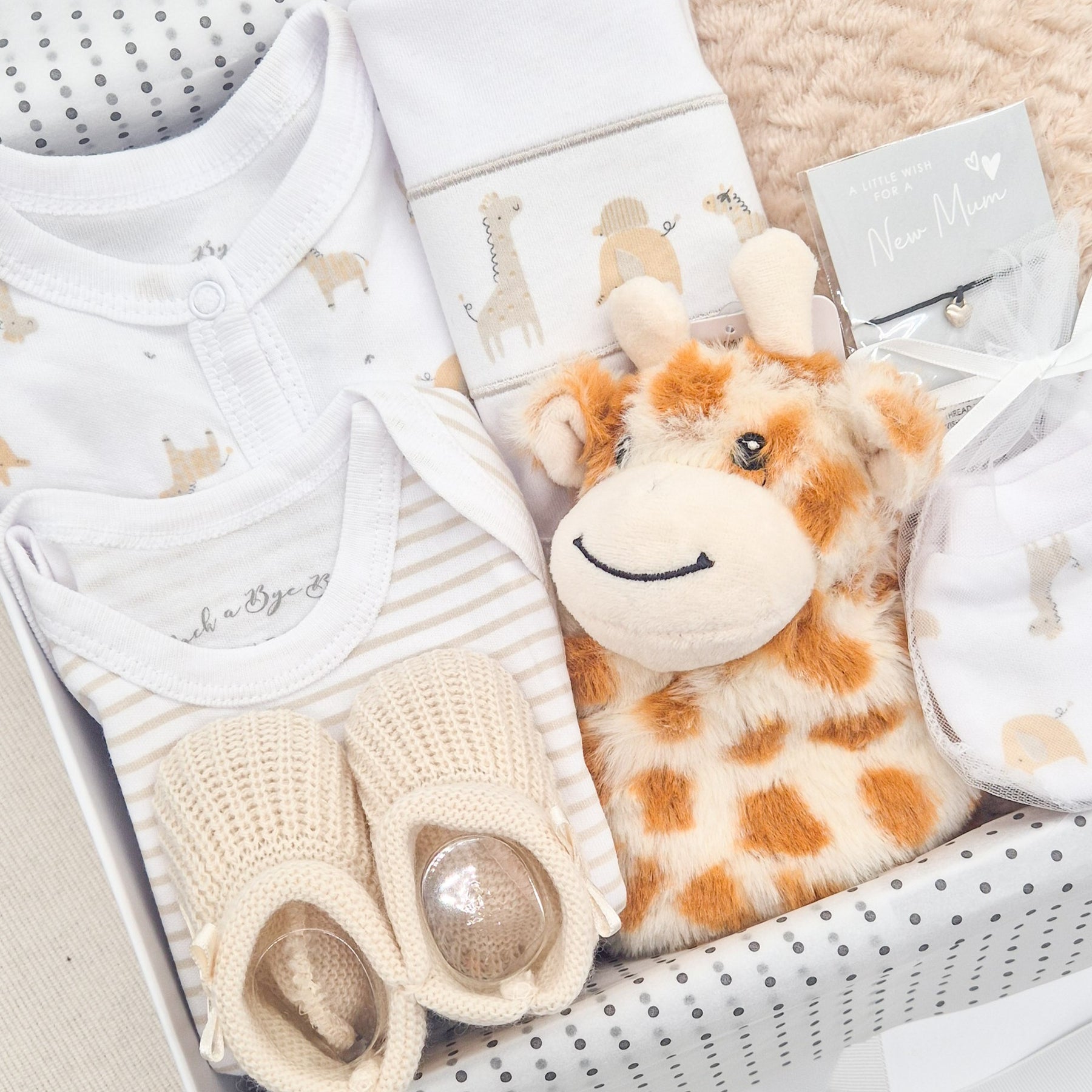 All clothing items are made from 100% cotton, ensuring they are gentle, breathable and kind to delicate newborn skin. The gift set is personalised using high-quality UV printing in black on the top, giving a crisp and long-lasting finish. Depending on availability, the included wish string will read either “New Mum” or “From Bump”, adding a sentimental finishing touch while allowing for natural stock variations.