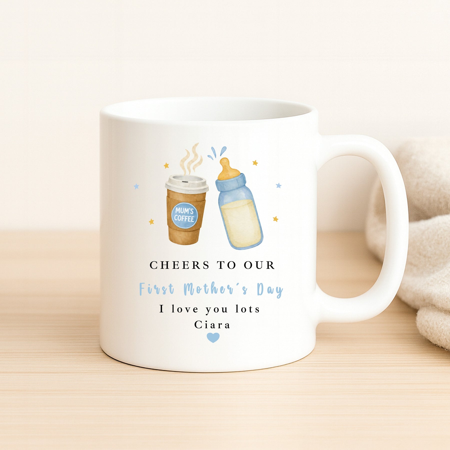 This personalised First Mother’s Day mug features a sweet illustrated coffee cup and baby bottle design with the message “Cheers to Our First Mother’s Day”. Finished with a personalised name sign-off, it’s a thoughtful keepsake created especially for a new mum. A perfect First Mother’s Day gift from baby, celebrating those early mornings and special first moments.