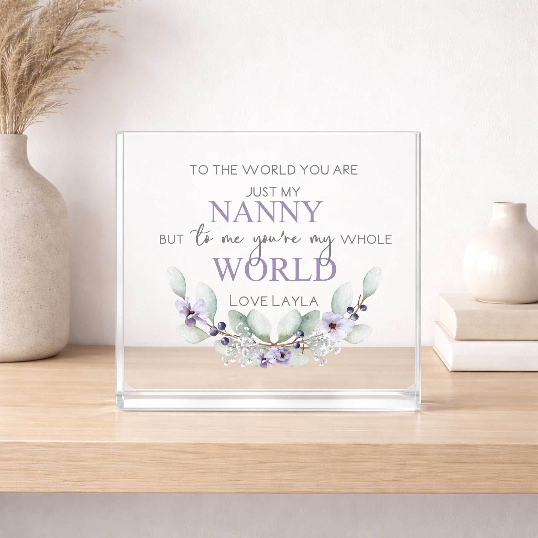 A beautiful UV printed clear acrylic block featuring the heartfelt message “To the world you are just my Nanny, but to me you’re my whole world”, finished with a soft floral wreath design. This keepsake is designed especially as a Mother’s Day gift for Nanny, personalised with a name to create a truly meaningful reminder of love from a child or grandchild.