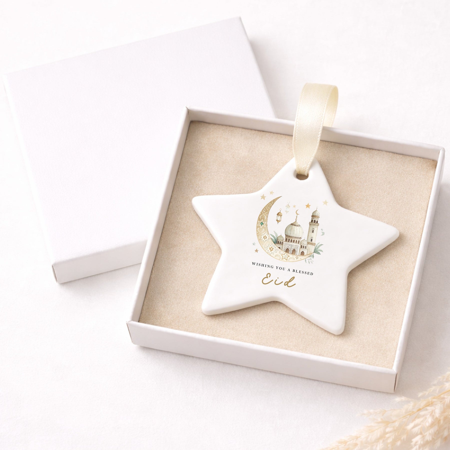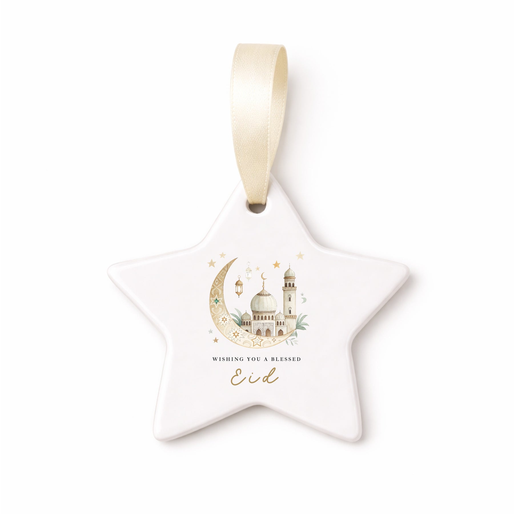 Celebrate the season with this elegant Blessed Eid star ceramic ornament, featuring a soft mosque and crescent moon illustration inspired by Islamic tradition. A timeless Ramadan and Eid keepsake, perfect for decorating the home or gifting to family, friends or loved ones during the holy season.