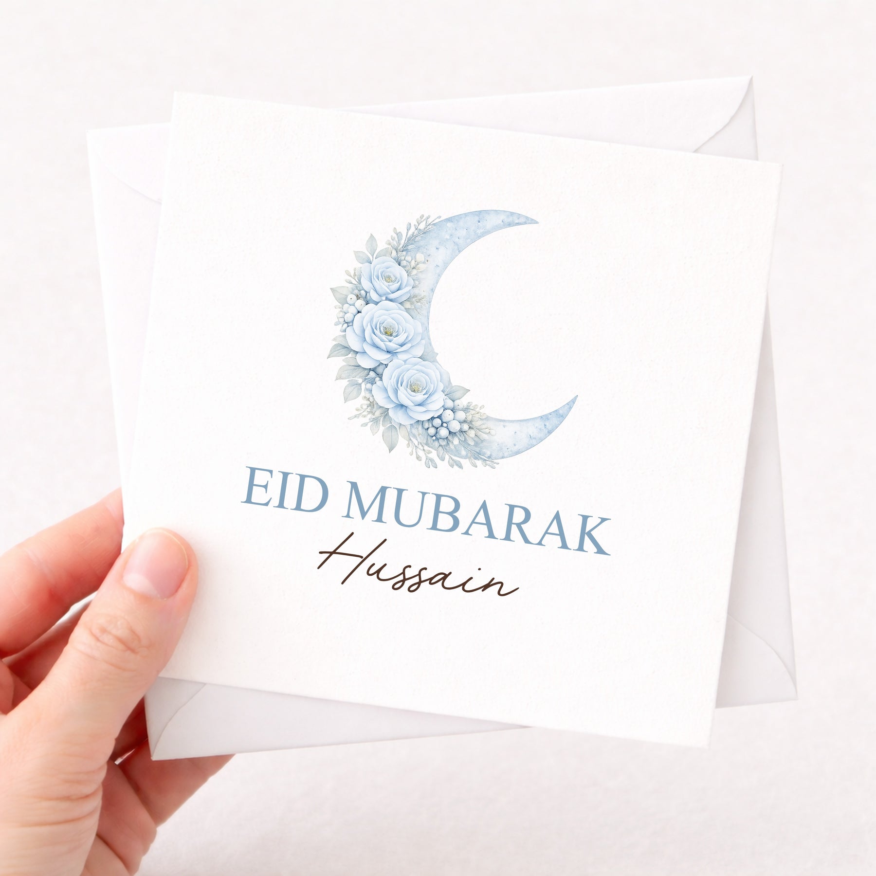 Celebrate Eid with this elegant personalised Eid Mubarak greeting card, featuring a delicate blue floral moon design inspired by Islamic traditions. A timeless card suitable for family, friends, sons, daughters, grandchildren or loved ones of any age, perfect for sharing meaningful Eid wishes.