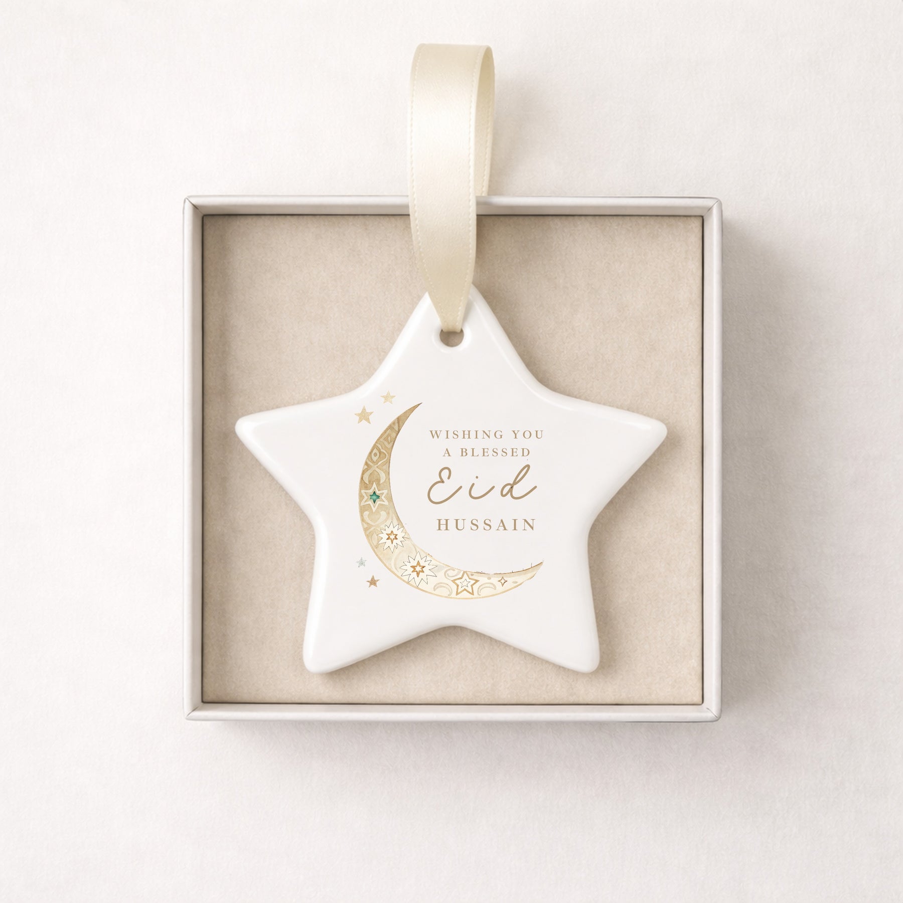 Celebrate the season with this elegant personalised Blessed Eid star ceramic ornament, featuring a delicate gold crescent moon design inspired by Islamic art. A timeless Ramadan keepsake and Eid decoration for family, friends, children or loved ones, perfect for sharing blessings during Ramadan and Eid.