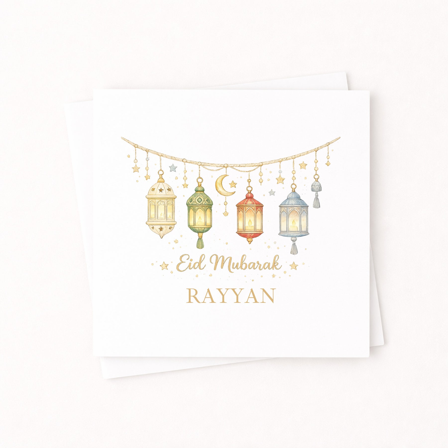 Celebrate Eid with this elegant personalised Eid Mubarak greeting card, featuring a beautiful hanging lantern design inspired by Ramadan traditions. Perfect for family, friends, sons, daughters, grandchildren or little ones, this card adds a thoughtful personal touch to your Eid celebrations.