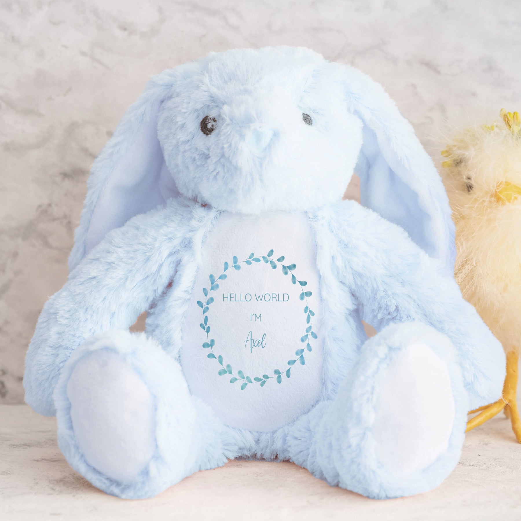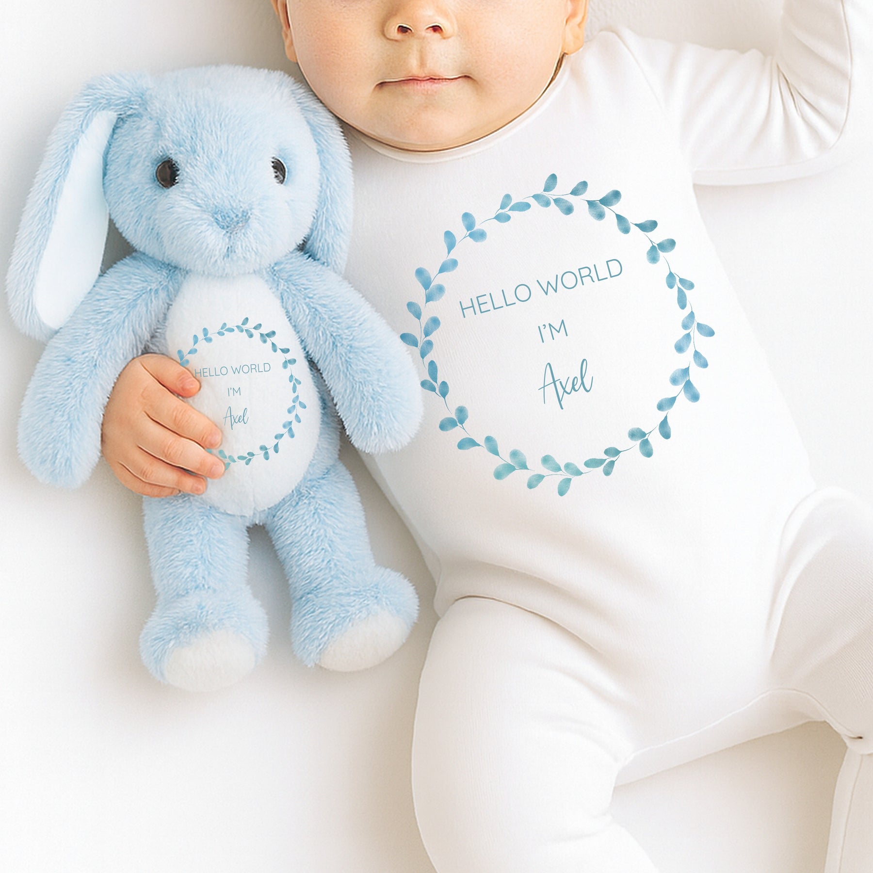 Welcome your little one in style with our “Hello World I’m…” personalised baby vest, babygrow, or matching bunny set — a beautiful keepsake to celebrate your baby’s arrival. Featuring a soft blue botanical wreath design with your baby’s name printed in the centre, it’s perfect for newborn photo shoots, birth announcements, or as a thoughtful baby shower gift. Each piece captures the joy of those first precious moments while creating a timeless memento to treasure.