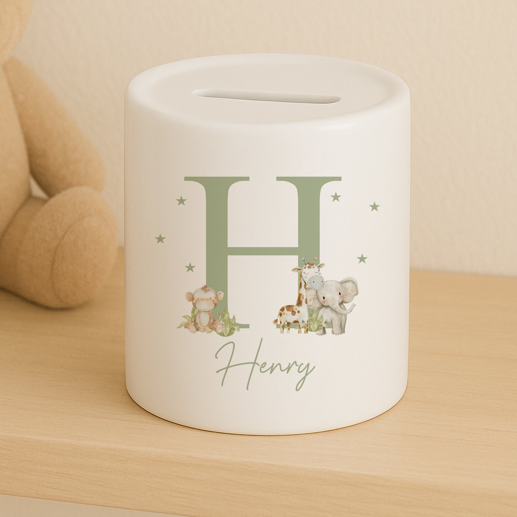 This personalised ceramic money box features a sage green jungle design, making it the perfect new baby gift. Add a personal touch with an initial of your choice, creating a unique and practical keepsake for the little one. Encourage good saving habits from an early age with this charming and thoughtful gift.