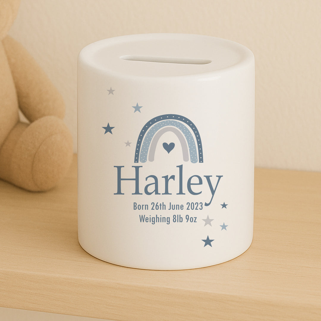 Personalised Blue Teddy Rainbow Ceramic Money Box