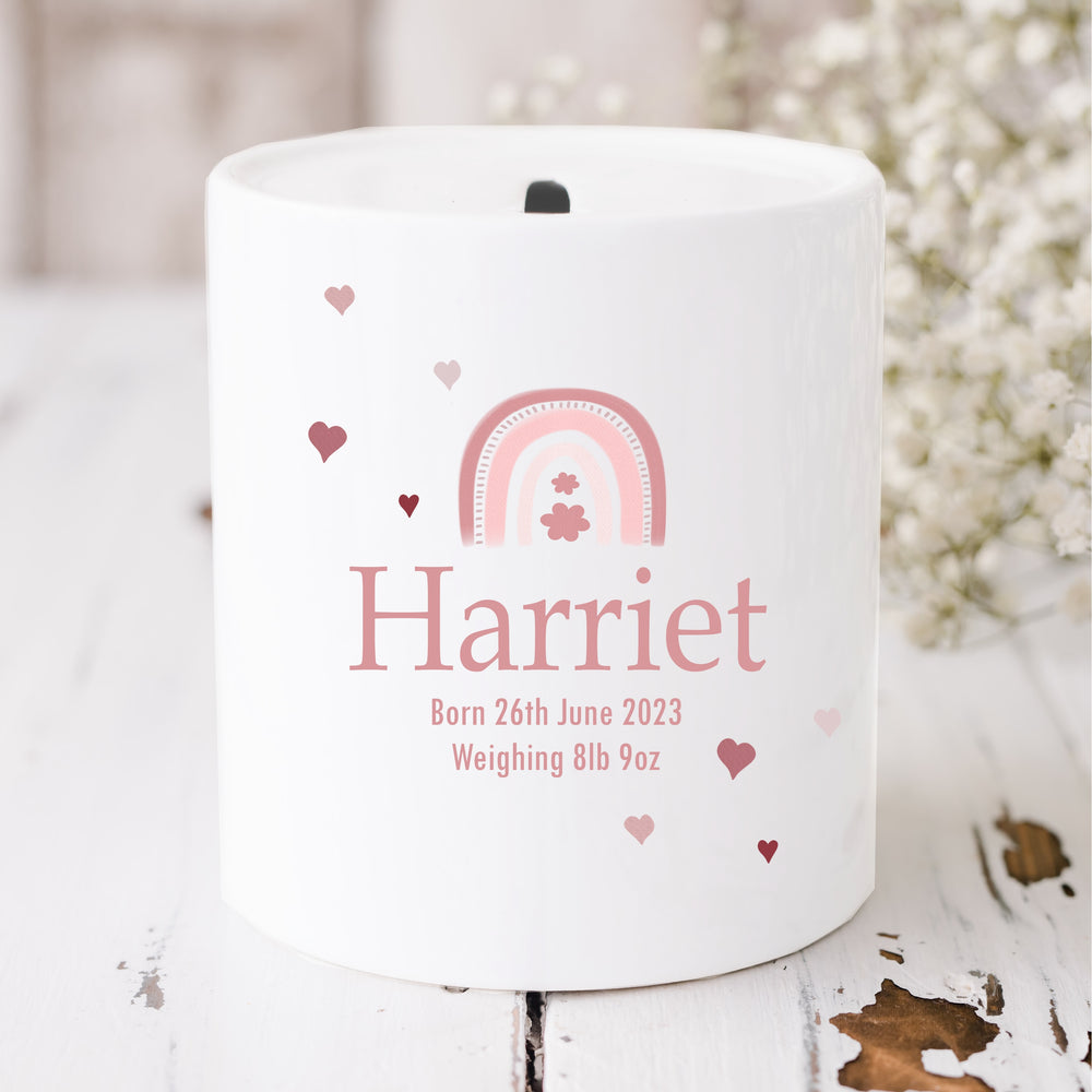 Personalised Pink Floral Rainbow Ceramic Money Box