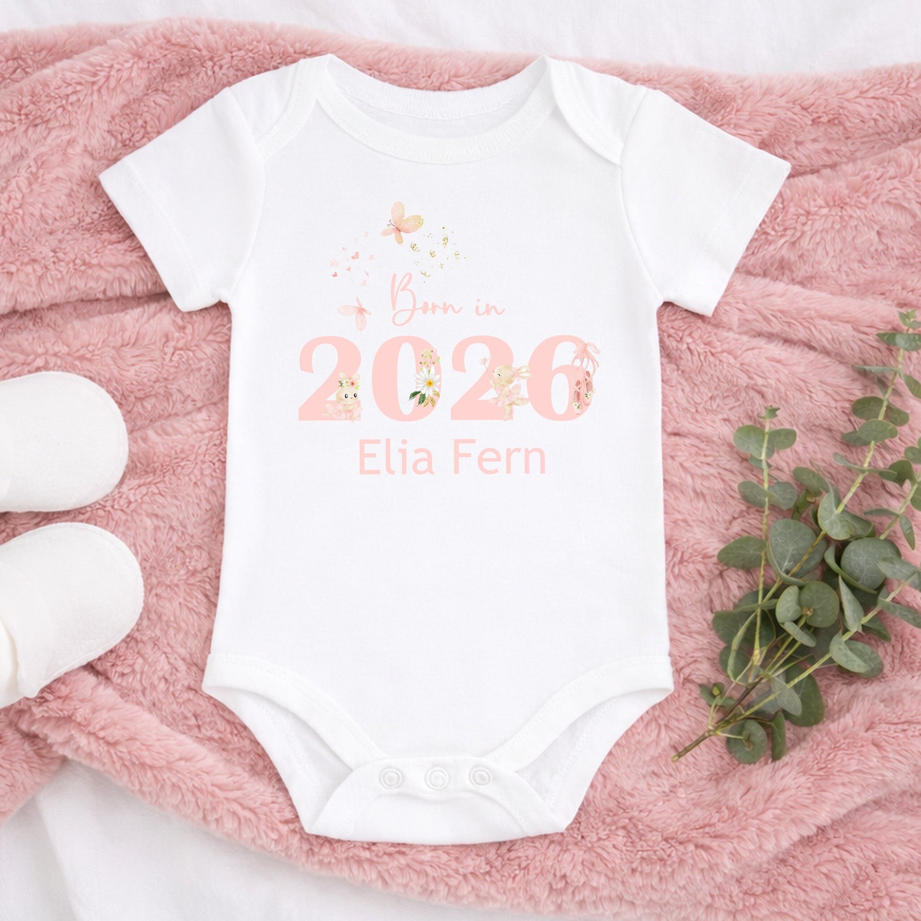 A personalised baby bib featuring a delicate pink “Born in 2026” design with sweet floral and bunny illustrations, finished with your baby’s name. A beautiful keepsake to celebrate your little one’s birth year.