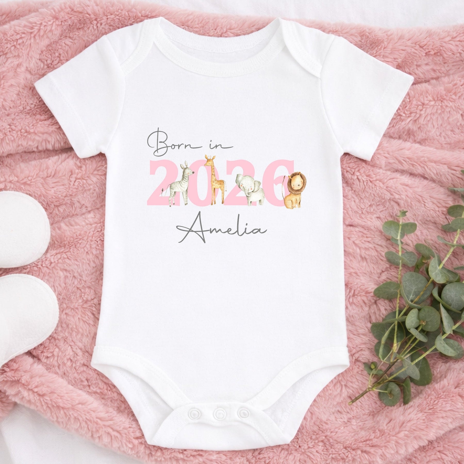 A personalised baby grow, vest or bib featuring a sweet pink safari “Born in 2026” design with adorable animal illustrations and your baby’s name. A lovely keepsake to celebrate your little one’s birth year.