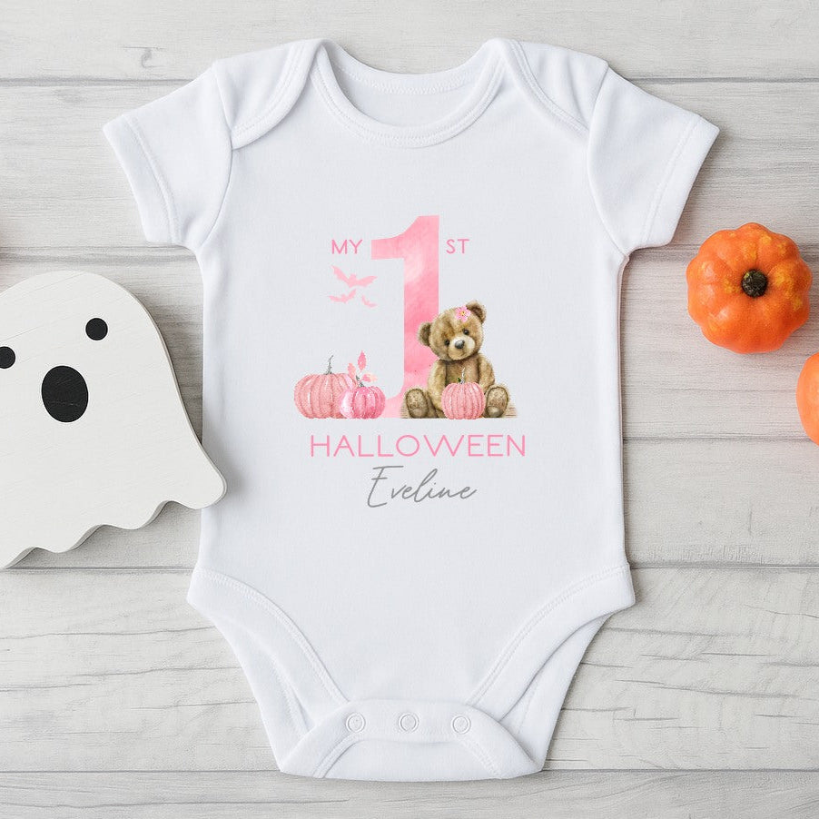 Personalised Pink Bear First Halloween Babygrow/Vest/Bibs