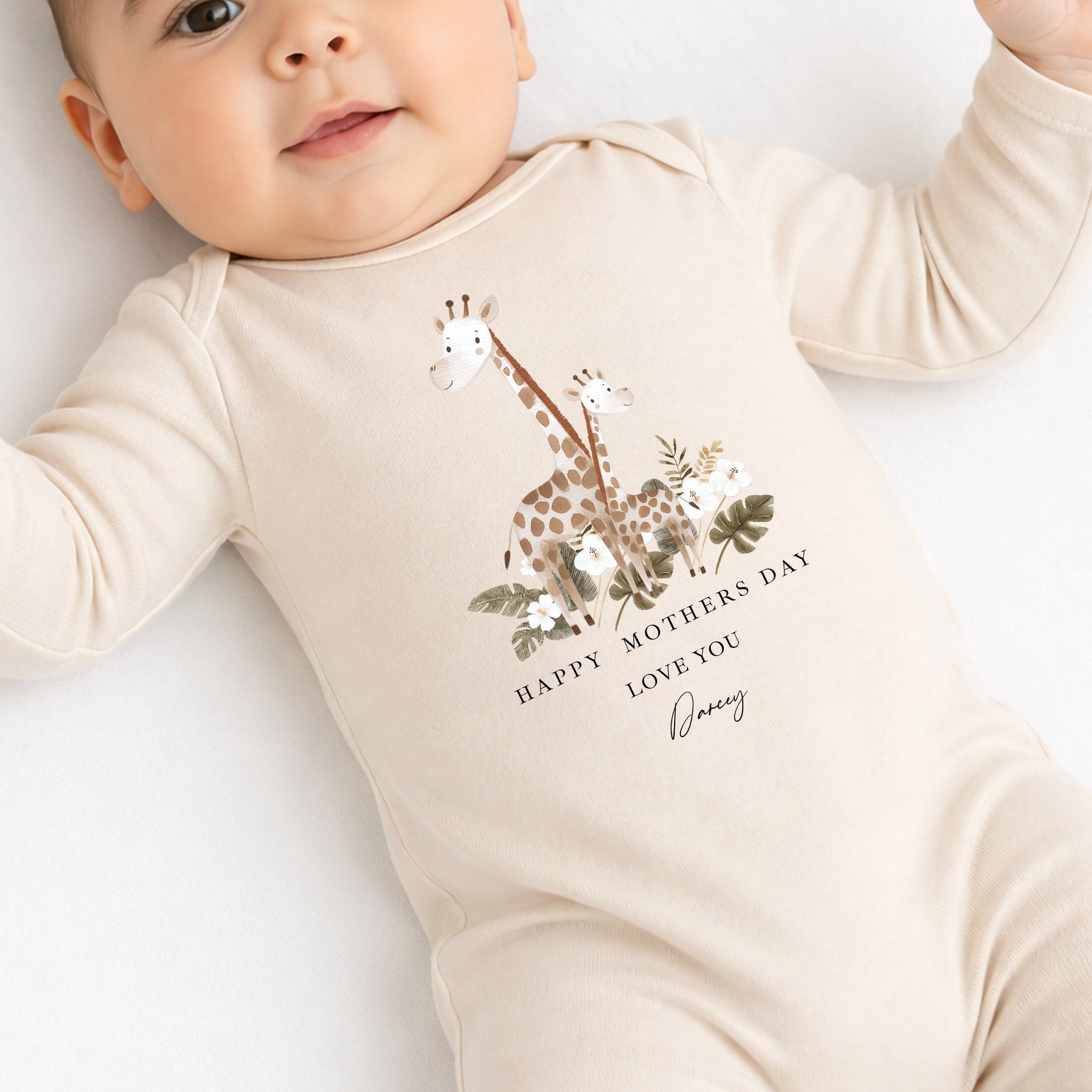 Personalised Beige Giraffes Happy Mother's Day Baby Grow, Vest or Bib