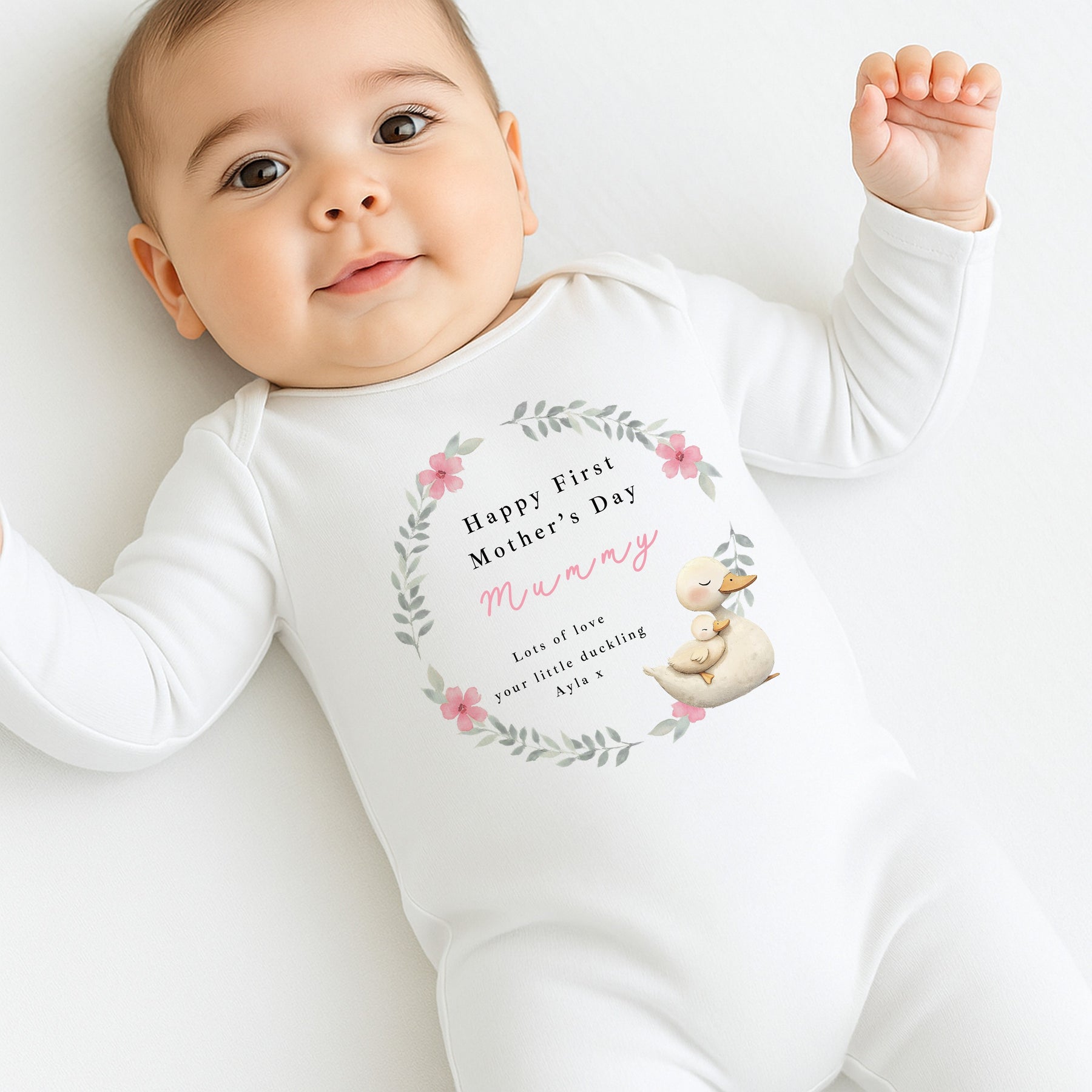 Personalised Duckling Wreath Happy First Mother's Day Baby Grow, Vest or Bib