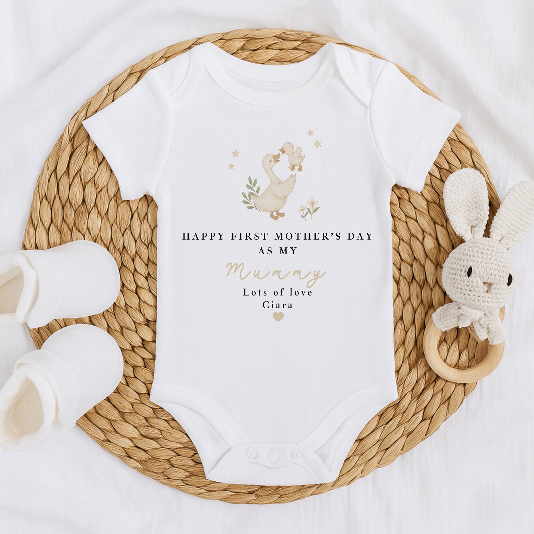 Celebrate My First Mother’s Day with this sweet personalised baby outfit, featuring a gentle mummy duck lifting her baby duckling illustration in soft neutral tones. Available as a babygrow, vest or bib, this meaningful keepsake is a lovely gift from baby to Mum and perfect for a new mum, first time mummy, or to mark our first Mother’s Day together. Suitable for baby girl or baby boy.