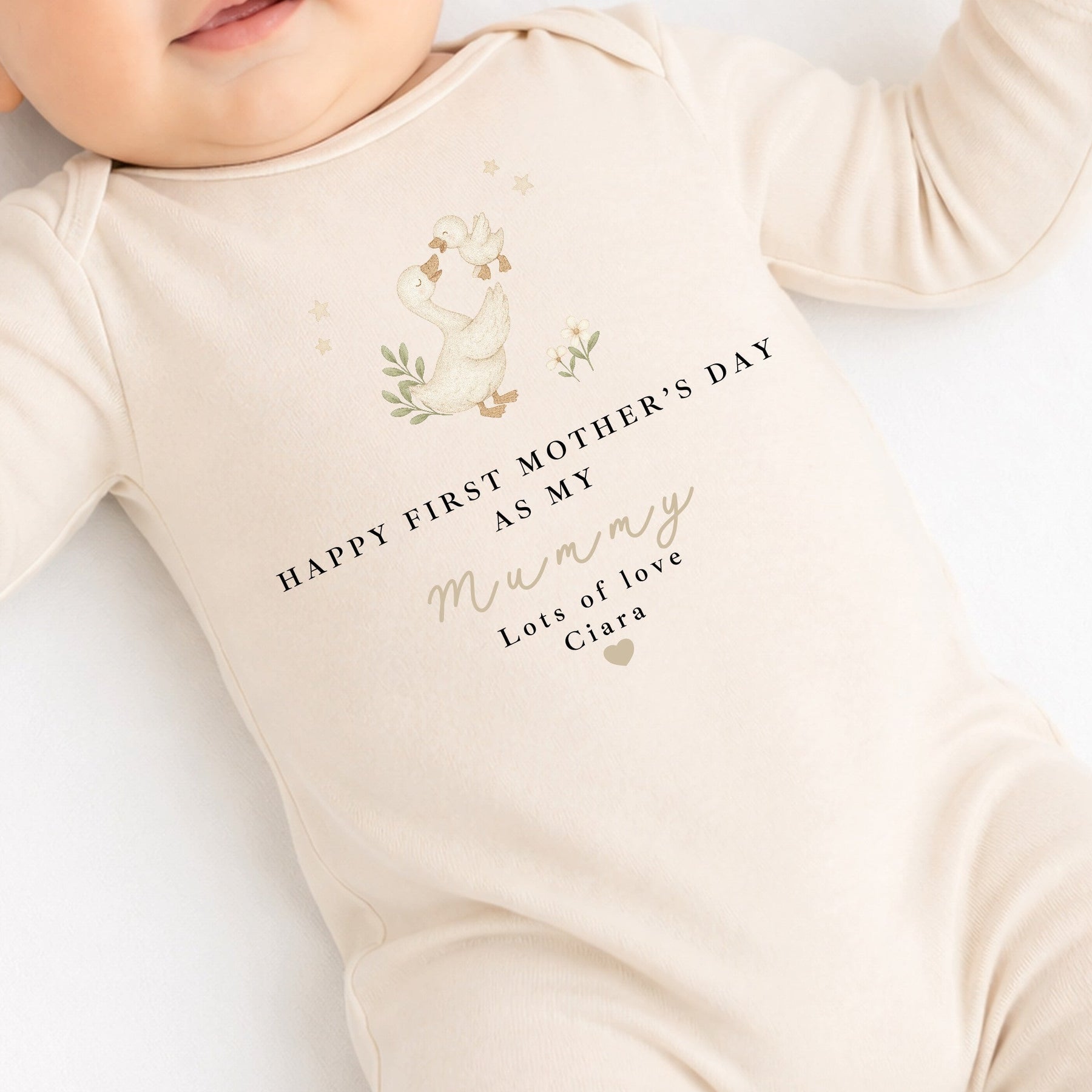 Personalised Ducks Beige Happy First Mother's Day Baby Grow, Vest or Bib